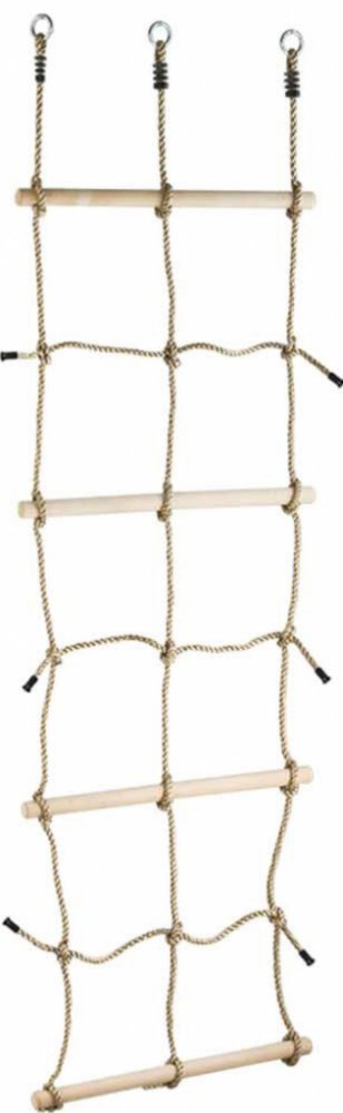 Šplhací síť s dřevěnými příčkami s 3 závěsnými kroužky. Nezbytný pomocník pro objevitele venkovní zábavy na moderním dětském hřišti nebo k domečku na stromě.