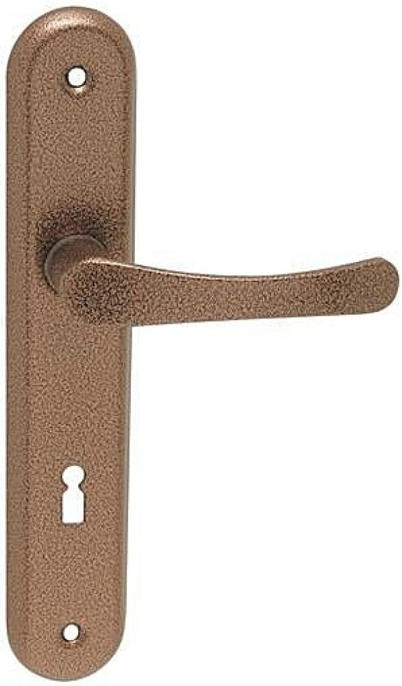 Štítová klika na interiérové dveře s oválným štítem je vyrobena z hliníku a je povrchově upravena. Oválný štít má rozměry 42 mm x 230 mm a klika neobsahuje vratný mechanismus.