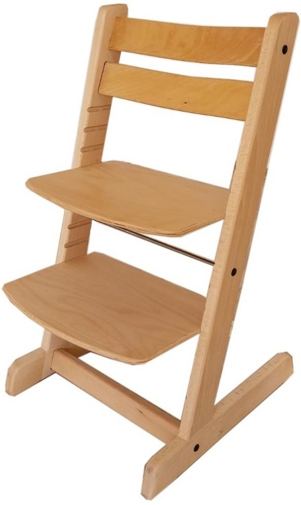 Český výrobek. Český design. Chráněný vzor. Jednoduchá montáž. Žádné podpěry, příčky nebo trojúhelníky navíc. Praktická dětská rostoucí jídelní židle Lucie Easy vyrobená z bukového masivu tloušťky 25 mm, sedáky jsou vyrobené z celobukové překližky 10 mm nosnosti 70 kg, (na rozdíl od Rostoucí židle Lucie, sedáky vyrobeny z překližky tloušťky 12 mm, proto také vyšší nosnost). Překližka se svou kons...