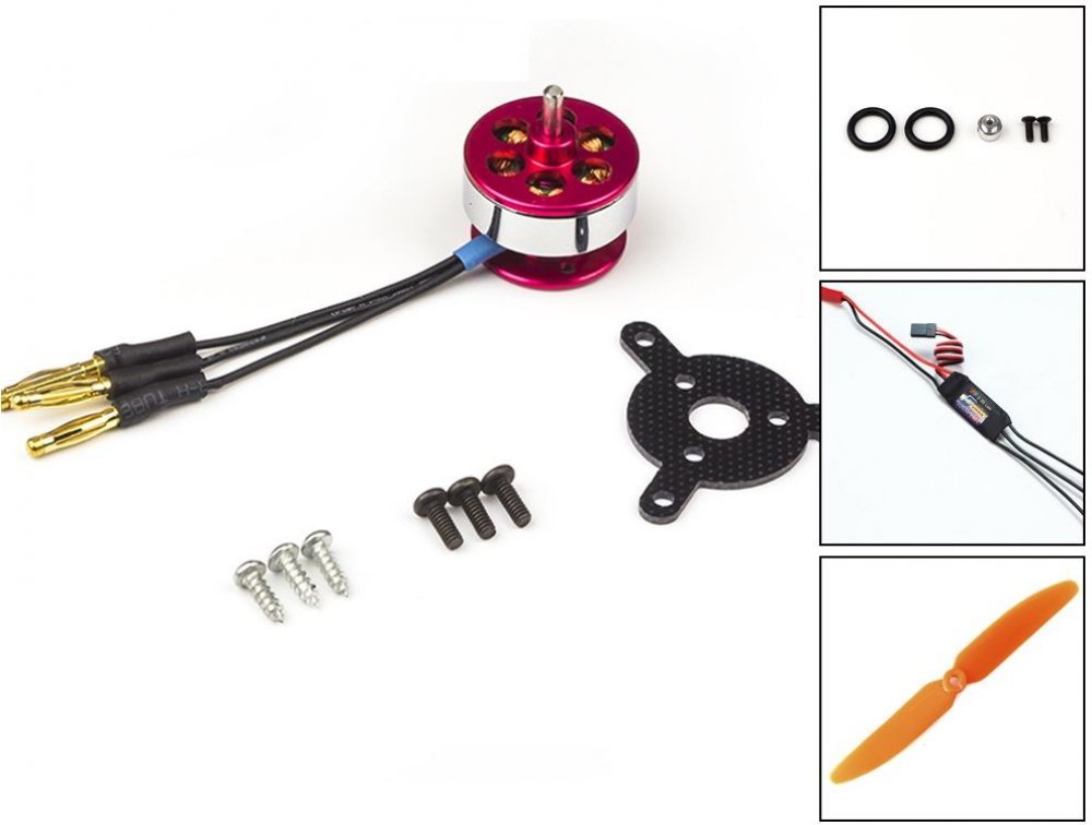 Součástí balení: 1x motor, 1x vrtulový unašeč, 1x 10A regulátor, 1x vrtule 5x3.