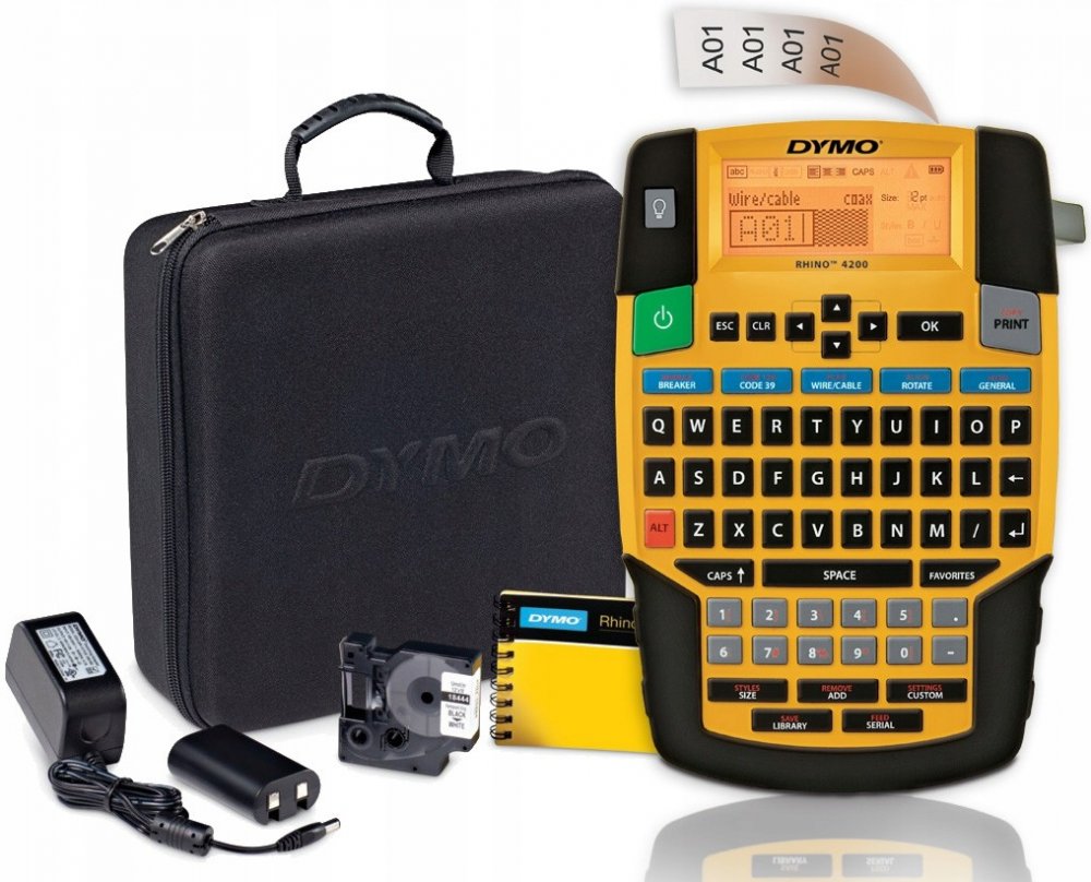 Klávesové zkratky umožňují rychlé vytváření a formátování kabelů/šňůr, příznaků, štítků s pevnou délkou a dalších položek, zatímco klávesa Oblíbené umožňuje přístup k nejčastěji používaným štítkům, symbolům a výrazům pomocí jedné klávesy. S tiskárnou Rhino 4200 můžete tisknout štítky až do šířky 3/4" z pružného nylonu, permanentního polyesteru a odolných vinylových materiálů " a také přímo na teplem smrštitelné trubičky. Integrované pryžové nárazníky pomáhají zabránit poškození způsobenému pády a pády při práci.