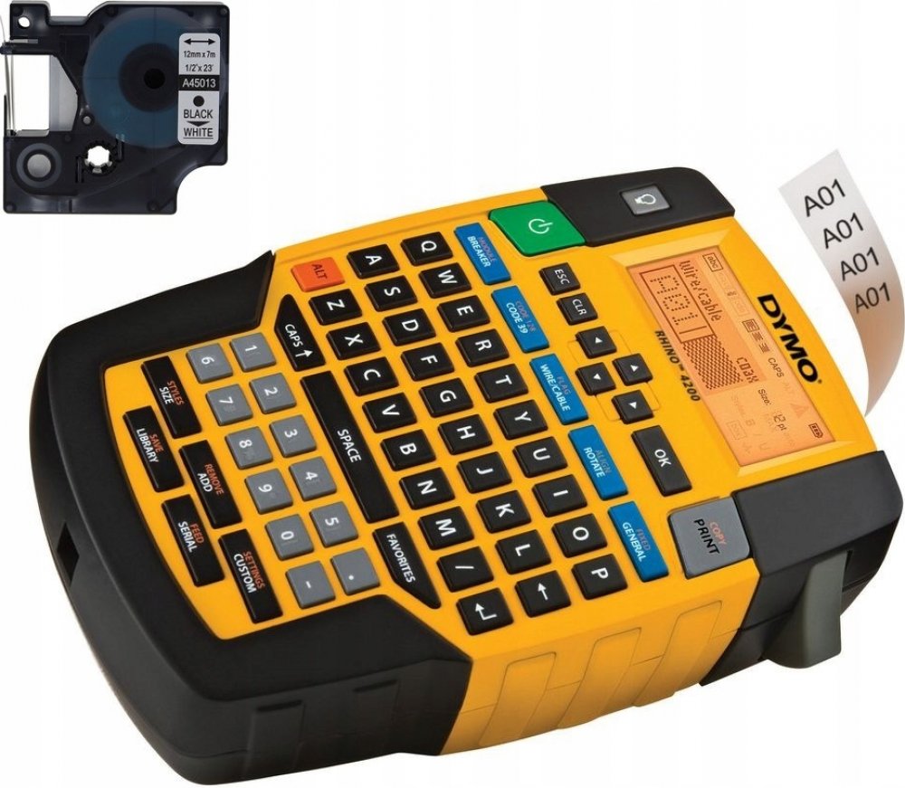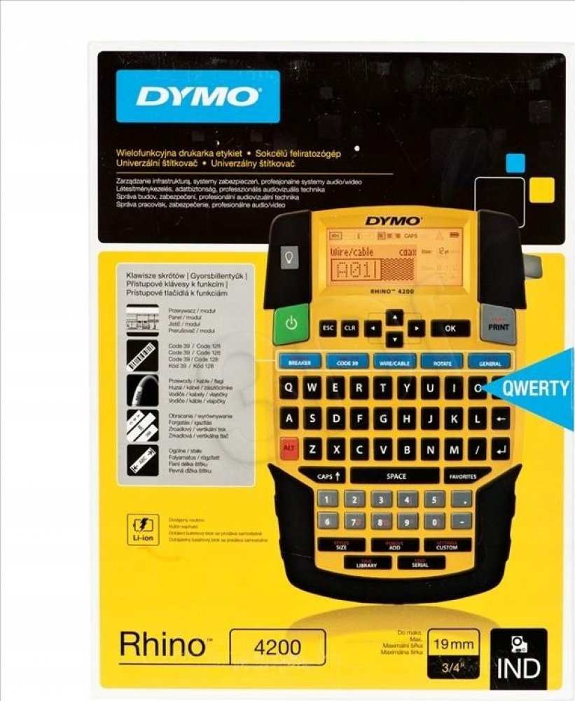 Dymo Rhino 4200 umožňuje rychlé a přesné etiketování. Běžná klávesnice QWERTY usnadňuje ovládání. Tlačítka přímého přístupu pro rychlé vytváření a formátování štítků pro popis vodičů a kabelů, praporkových štítků, čárových kódů Code 39 a Code 128, štítků s pevnou délkou, štítků pro jističe a mnoha dalších. Tiskne štítky šířky až 19 mm z pružného nylonu, trvanlivého polyesteru i odolného vinylu - a tiskne dokonce přímo na smršťovací bužírky. Čas šetří také tlačítko pro vlastní nastavení a tlačítko "oblíbené", které umožňuje přístup k často užívaným etiketám, symbolům a termínům.