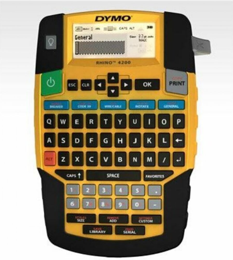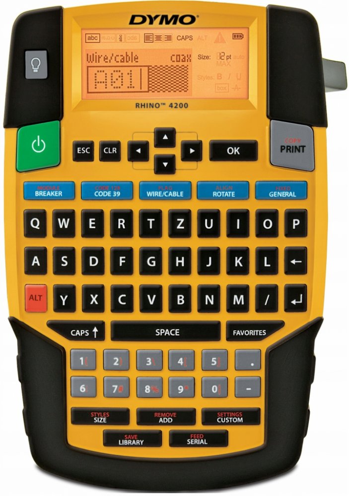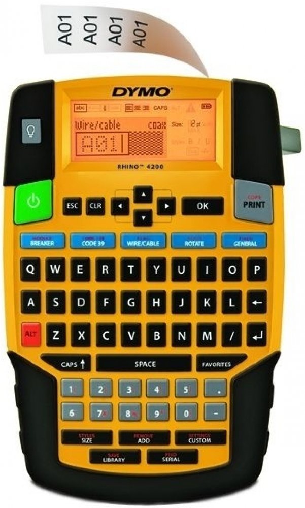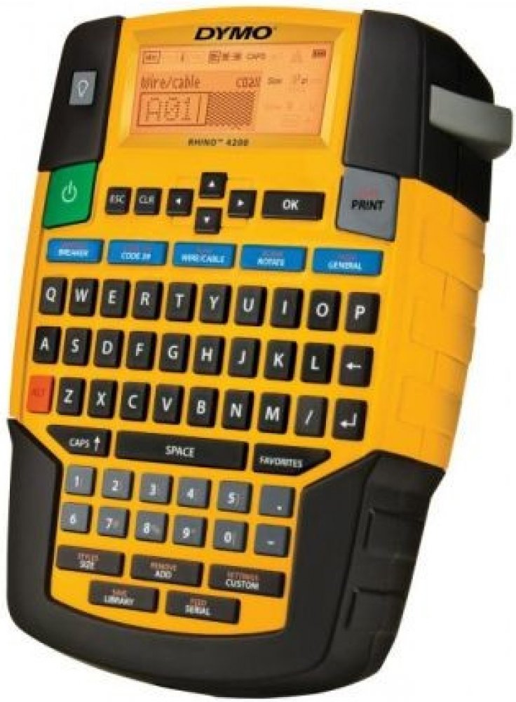 Dymo Rhino 4200 umožňuje rychlé a přesné etiketování. Běžná klávesnice QWERTY usnadňuje ovládání. Tlačítka přímého přístupu pro rychlé vytváření a formátování štítků pro popis vodičů a kabelů, praporkových štítků, čárových kódů Code 39 a Code 128, štítků s pevnou délkou, štítků pro jističe a mnoha dalších.