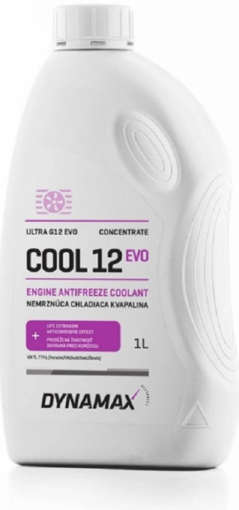 DYNAMAX COOL ULTRA 12 EVO DYNAMAX COOL ULTRA 12 EVO je speciální vysoce kvalitní nemrznoucí směs do chladicích systémů nejmodernějších spalovacích motorů koncernu Volkswagen na bázi hliníku nebo hliníkových slitin. Splňuje požadavky a je vhodná pro chladicí systémy hybridních a elektrických vozidel. Poskytuje vynikající ochranu před přehříváním, zamrzáním, korozi a tvorbě usazenin v chladících systémech a neutralizuje vodu s vysokým obsahem minerálů. Díky zvýšenému obsahu inhibitorů koroze vyhovuje nejvyšším požadavkům koncernu Volkswagen -splňuje normu VW TL 774 L (G12EVO). DYNAMAX COOL ULTRA 12 EVO je možné míchat se svými předchůdci G13, G12++, G12, G11. Slouží jako plnohodnotná náhrada pro chladící kapaliny, které jsou vyrobené na bázi 1,2 -etylenglykolu (a nebo glykolu). Je šetrnější k životnímu prostředí a nahrazuje předchůdce G13, G12++, protože neobsahuje dusičnany a aminy. Nepoškozuje gumu. Obsahuje etylenglykol a vysoce organické inhibitory koroze. Lakované povrchy je nutné po postříkání umýt vodou. Obsahuje speciální chuťovou složku, které zabraňuje náhodnému požití tekutiny. Používá se po zředění dle informací níže. Možné ředit na požadovaný bod mrazu demineralizovanou nebo pitnou vodou. Kompatibilní s kovovými materiály. 1 díl DANYMAX COOL ULTRA G12 EVO/1 díl vody -použití do -37 °C 1 díl DYNAMAX COOL ULTRA G12 EVO/1,5 dílu vody -použití do -27 °C 1 díl DYNAMAX COOL ULTRA G12 EVO/2 díly vody -použití do -18 °C