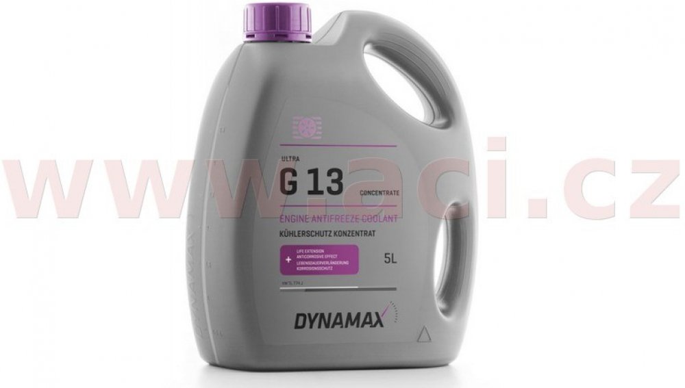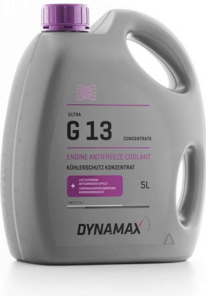 Dynamax Cool Ultra G13 Charakteristika: Speciální vysokokvalitní nemrznoucí kapalina do chladících systémů motorů na bázi hliníku nebo slitin. Obsahuje ethylenglykol a vysokoúčinné organické inhibitory koroze. Neobsahuje dusitany, fosfáty, aminy. Je mísitelná s celou řadou chladicích kapalin na bázi ethylenglykolu, nepůsobí negativně na gumu. Vyniká zvýšenou účinností proti korozi a usazeninám. Zabraňuje korozi různých materiálů jako např. měď, slitina, mosaz nebo ocel. Vyhovuje normě VW TL 774 Je růžové barvy. Výměnná lhůta vzhledem k složení této nemrznoucí kapaliny při běžném použití je 5 let. Obsahuje speciální chuťovou složku, která zabraňuje náhodnému požití kapaliny. Vzhled: Je to kapalina, růžová se slabou opalescencí. Použití: Používá se pro chladicí systémy nejmodernějších spalovacích motorů na bázi hliníku nebo slitin. Slouží jako plnohodnotná náhrada chladicích kapalin, které jsou vyráběny na bázi 1,2 - ethylenglykolu (resp. glykolu). Lze ředit na požadovanou teplotu destilovanou vodou nebo kvalitní pitnou vodou. Nepoškozuje kovové materiály. Lakované povrchy je nutné po potřísnění omýt vodou.