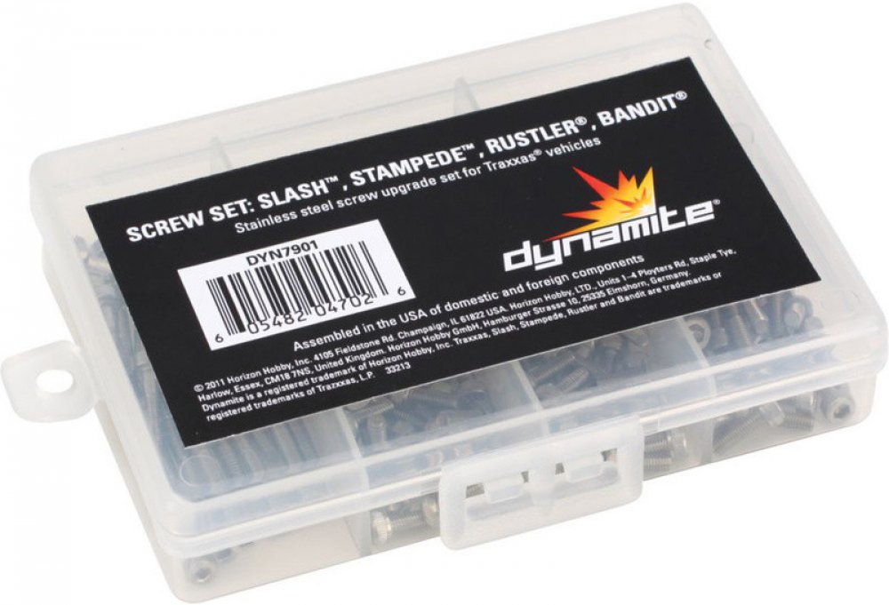 Dynamite sada nerezových šroubů, matic a podložek pro 2WD RC modely aut Traxxas Slash, Stampede, Rustler, Bandit. Dodává se v plastové krabičce, celkem 177 kusů. Dynamite sada nerezových šroubů, matic a podložek pro 2WD RC modely aut Traxxas Slash, Stampede, Rustler, Bandit. Dodává se v plastové krabičce, celkem 177 kusů.