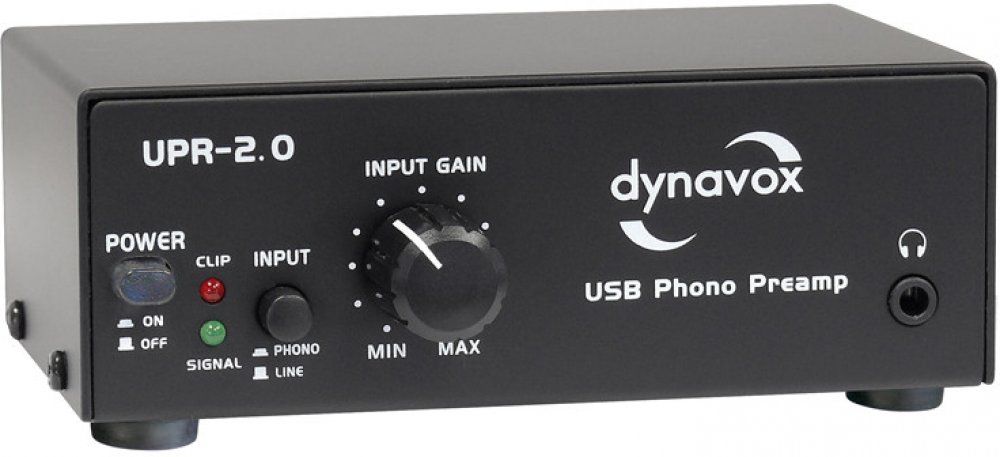 Kvalitní Phono předzesilovač pro gramofonové přístroje s nastavitelnou vstupní úrovní. Dynavox USB 2.0 phono předzesilovač UPR-2.0 může být napájen buď přes USB připojení, nebo prostřednictvím volitelné napájecí jednotky (9-12 V AC / DC 300 mA - zásuvka 5,5 / 2,1 mm).