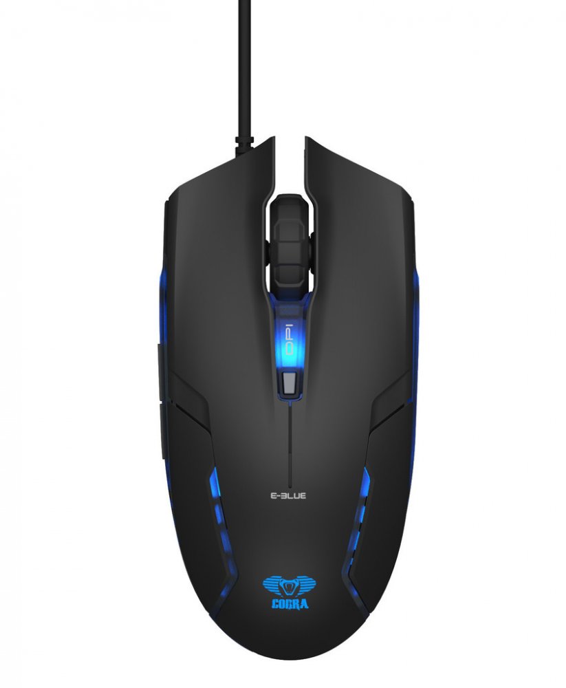 Na několika místech myš vyzařuje tajemné modré LED světlo, aby zvýšila svou atraktivitu pro hráče. Podsvíceno je logo E-Blue v dolní části těla myši, efektní detaily kolem něj a DPI přepínač.
