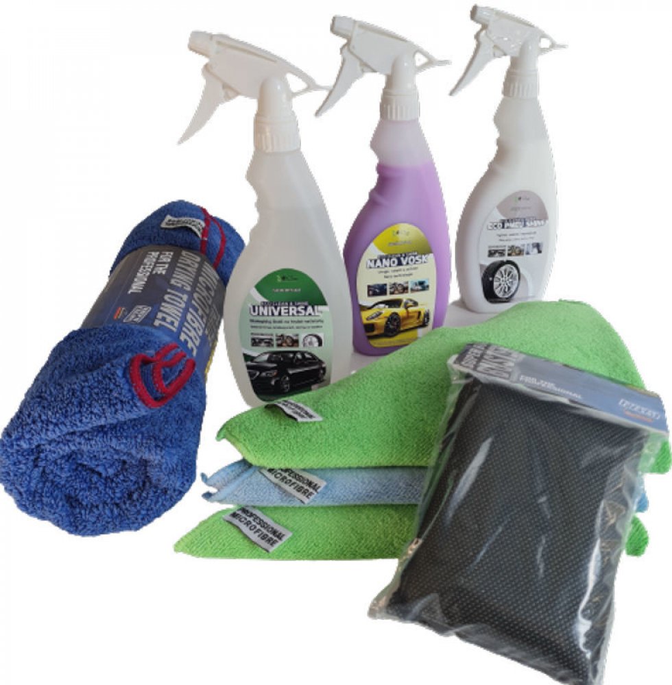 Tato sada autokosmetiky a příslušenství vám umožní důkladného umytí na bezkontaktní myčce a následné péči při detailním dolešťování. Zbavíte se mušek, mízy ze stromu, asfaltu a to rychle a šetrně jednoduše pomocí Houby na hmyz a asfalt. Auto po umytí rychle vysušíte, abyste předešli kapkám po vodě neboli vodním spotům