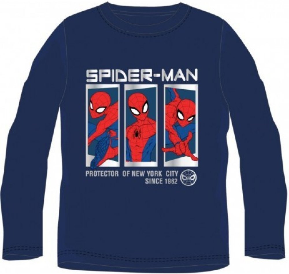 Krásné modré triko s motivem Spiderman Marvel. Je vyrobené z příjemného 100% bavlněného materiálu. Tričko má kulatý výstřih, dlouhé rukávy a přední stranu zdobí obrázek Spidermana.