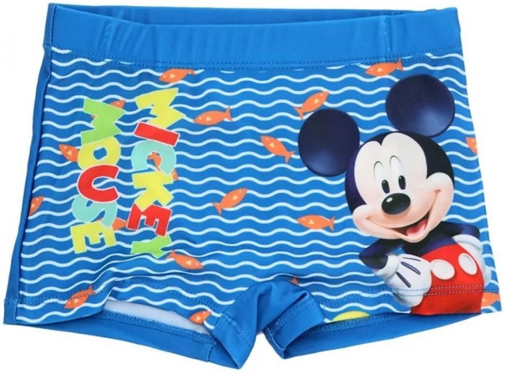 Dětské plavky boxerky pro kluky Mickey Mouse - Disney. Přední stranu plavek zdobí obrázek legendárního Mickey Mouse, vlnky a v nich spousta rybek. Na přední části je z vnitřní strany jemná bílá podšívka. Materiál plavek je elastický, takže se dobře přizpůsobí tělu a pohodlně se nosí. Zadní strana plavek a široká guma v pase je modrá.