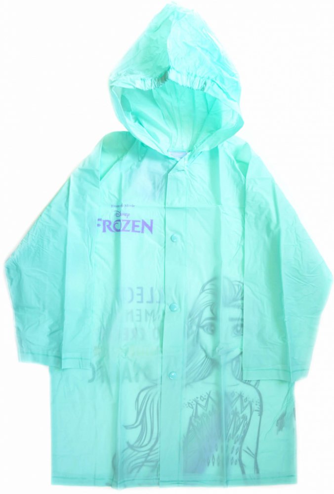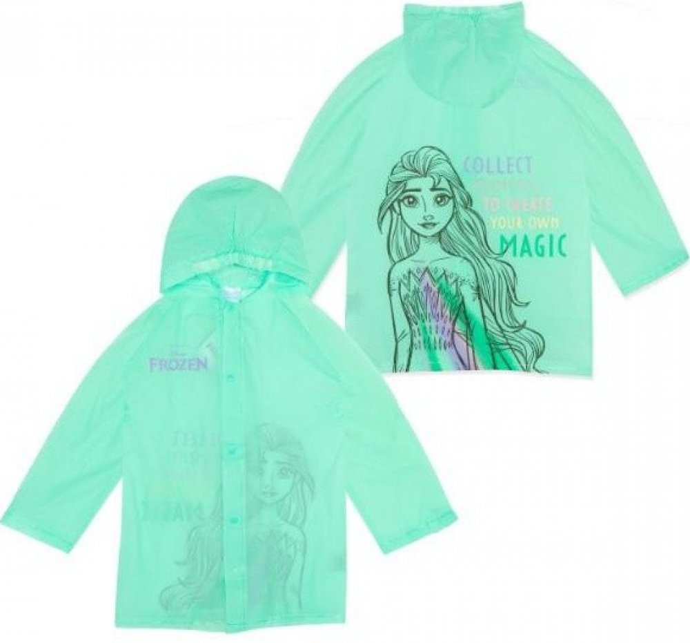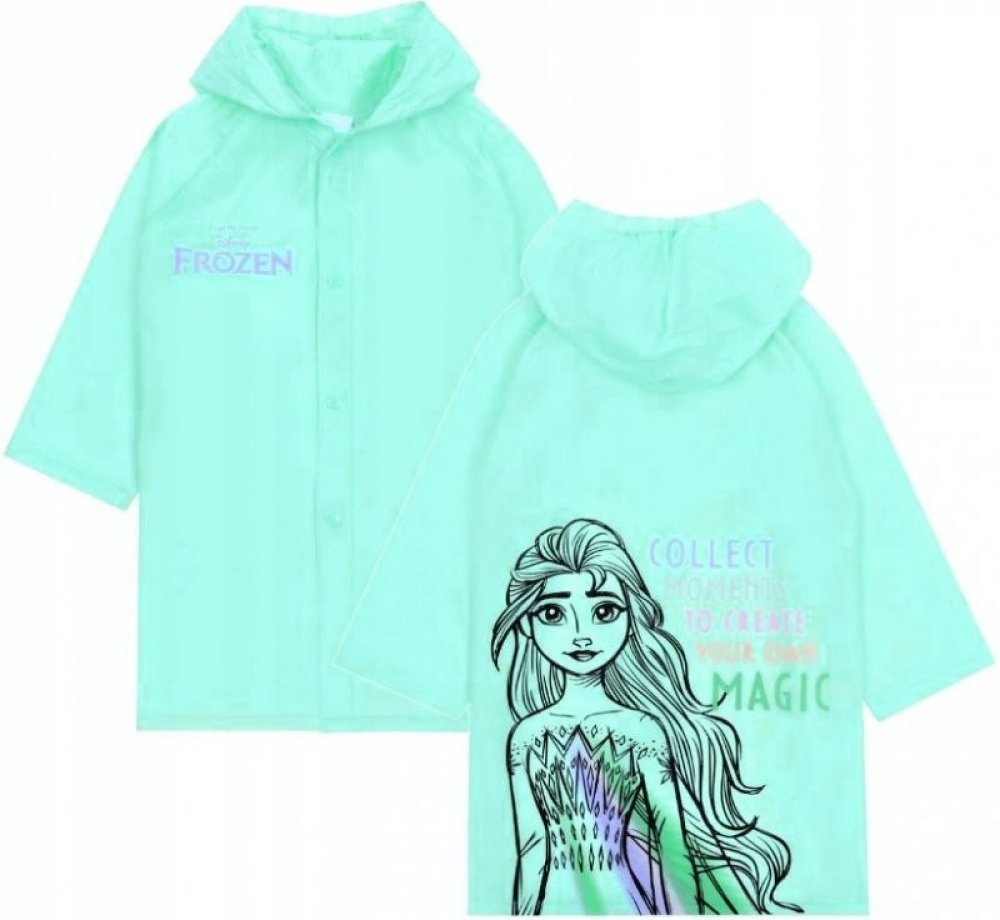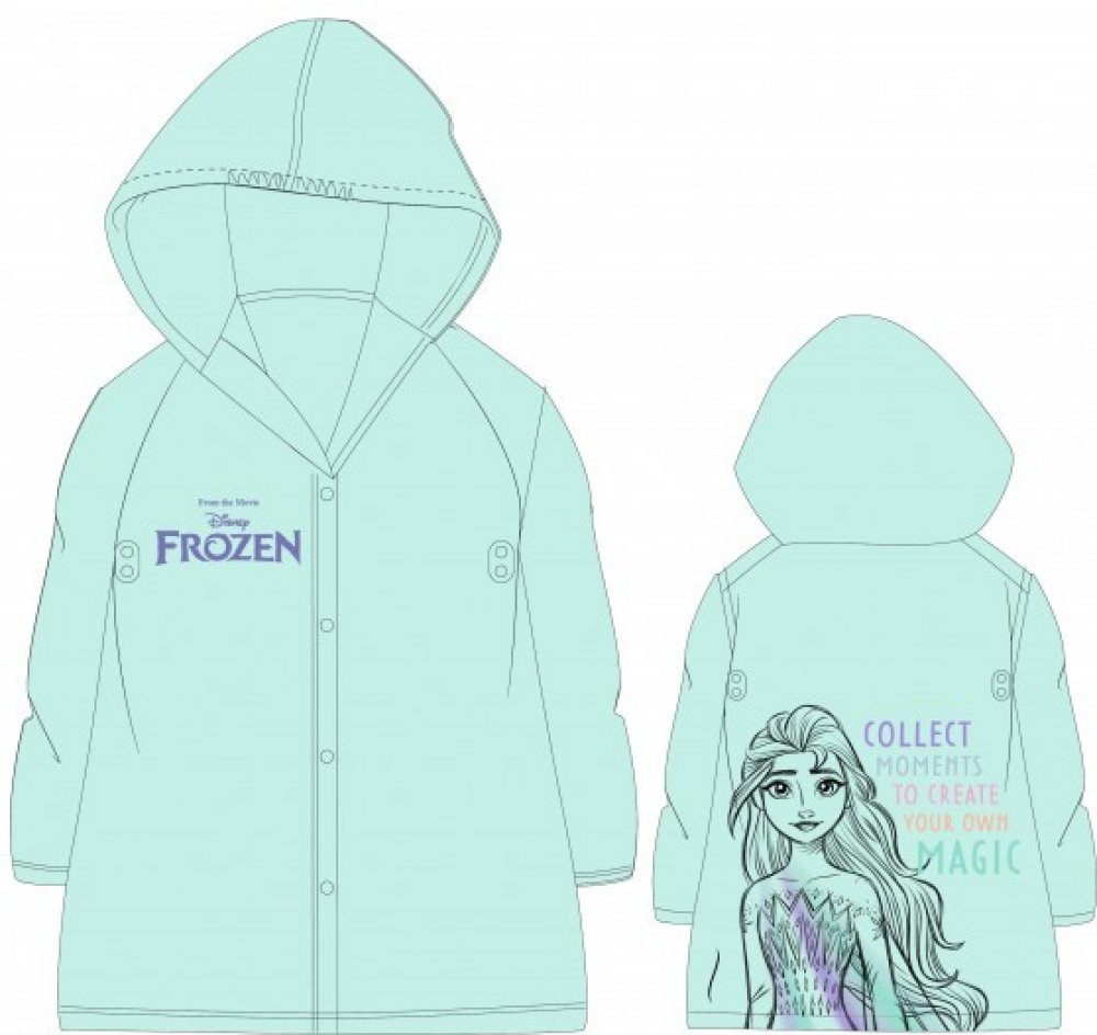 Dětská pláštěnka Ledové království 2 - Frozen 2. Je vyrobena z měkkého, ale přesto pevného PVC mentolově zelené barvy. Má zapínání na druky a větrání v podpaží. Na přední straně je ozdobena logem Frozen, na zadní straně je silueta princezny Elsy a nápis Collect moments to create your own magic. Tuto pláštěnku pro holky dodáváme ve velikostech 104/110, 116/122, nebo 128/134.