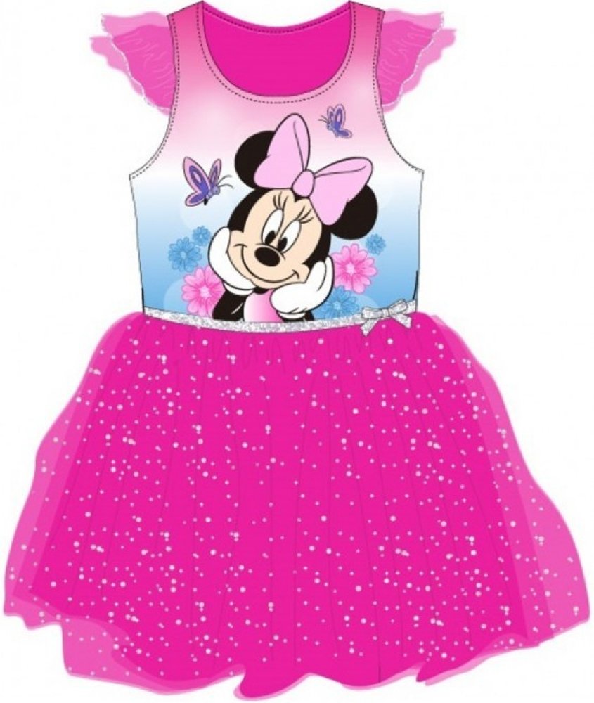 Krásné růžové dívčí šaty s krátkým rukávem s motivem Minnie Mouse. Vrchní část je vyrobená ze růžového materiálu, spodní část zdobí týlová sukýnka. Přední stranu zdobí obrázek myšky Minnie. Šatičky potěší každou malou princeznu.