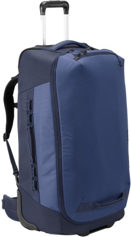 odolné modré zavazadlo 84l na 2 kolečkách nositelné jako batoh díky ramenním popruhům, s uzamykatelnými zipy, dvěma organizačními kapsami, ID štítkem, rukojetí odolnou proti nárazu, čtyřmi držadly a vnějšími poutky pro upevnění dodatečné výbavy