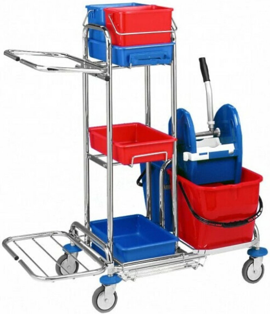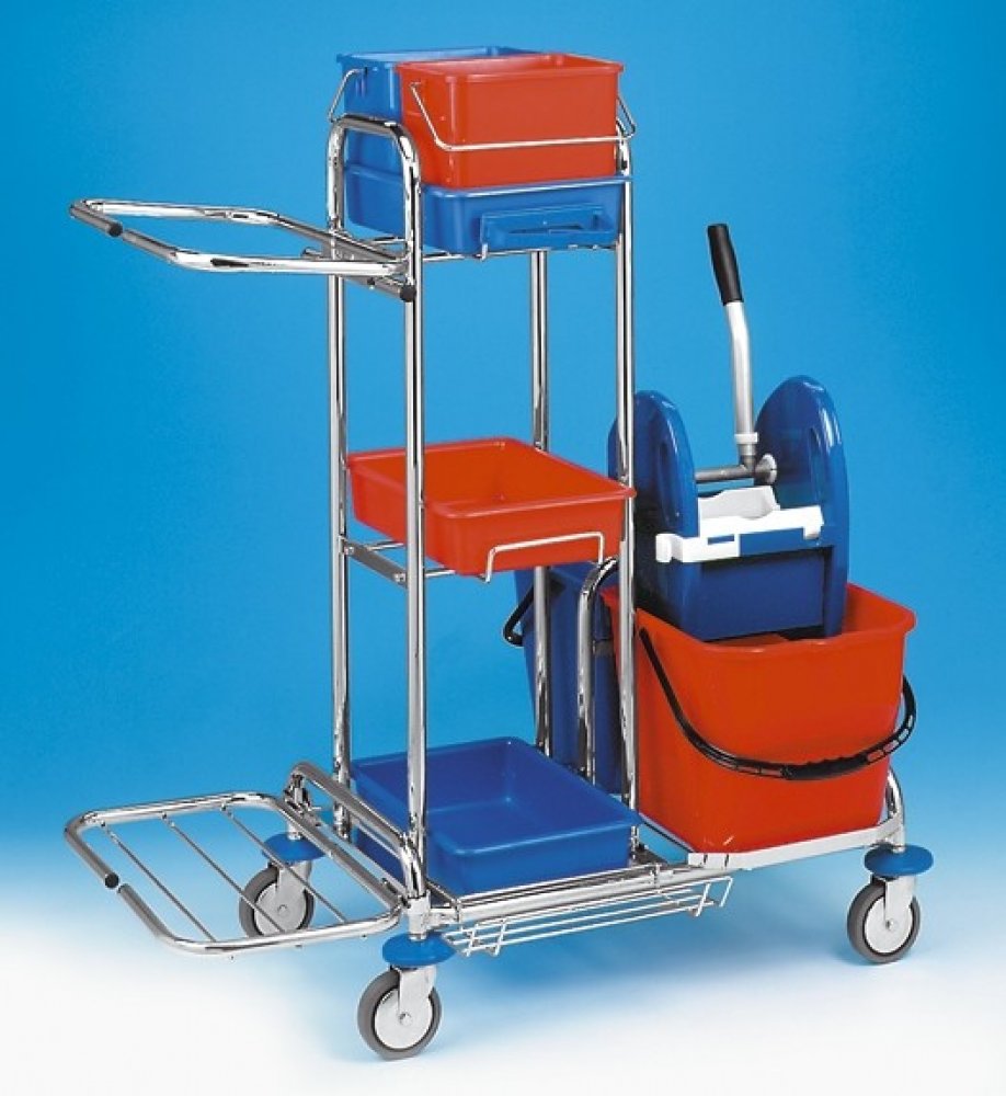 Úklidový vozík KOMBI JOKER je vyroben z pochromovaného kovu, příslušenství vozíku je vyrobeno z masivního plastu.