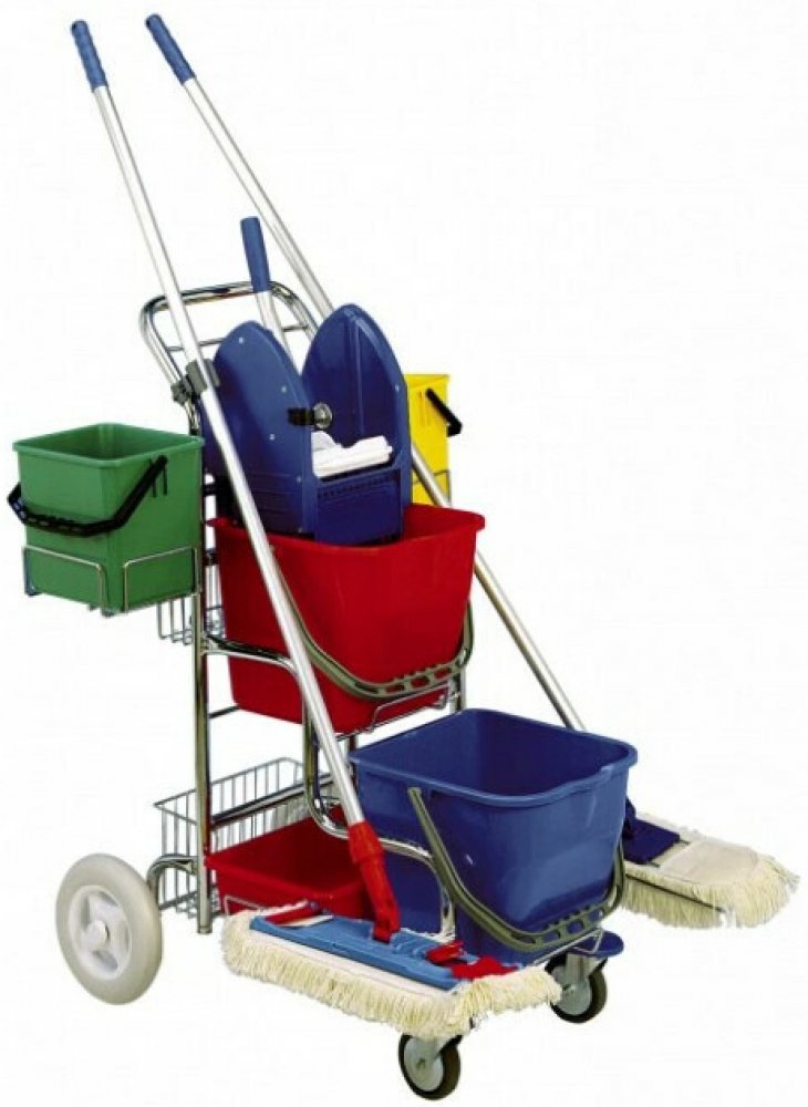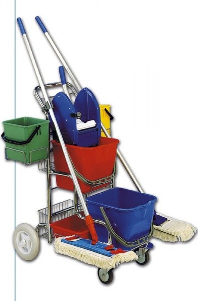 Úklidový vozík TERRY LINE obsahuje: podvozek schodišťového vozíku, 2x kbelík 17 l, ždímač, 2x košík 6 l, 2x kbelík 6l, 2x košík zadní úchyt, vanička JOOKY, držák tyče ALU, podpěra mopu.