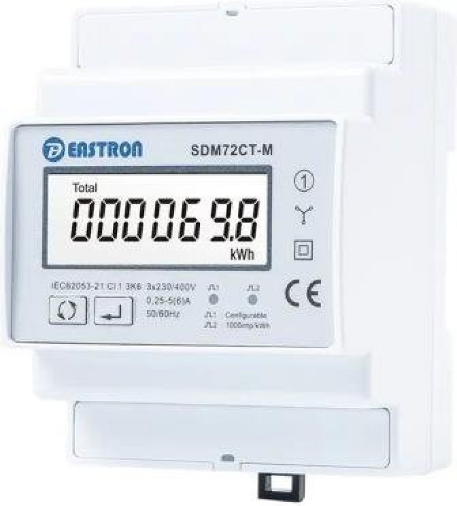 Třífázový elektroměr, který kromě měření činné energie (kWh) a výkonu (W) podporuje komunikaci přes RS-485 RTU Modbus , což umožňuje snadnou integraci do monitorovacích a řídicích systémů. Krytí IP51 poskytuje ochranu proti prachu a vodě, což zajišťuje spolehlivost v náročných podmínkách. Dále je vybaven pulsními výstupy pro měření spotřebované energie, které umožňují snadné monitorování a zaznamenávání dat externími zařízeními. Navíc podporuje obousměrné měření , což znamená, že dokáže zaznamenávat jak energii odebíranou ze sítě, tak i energii vracenou zpět do sítě.
