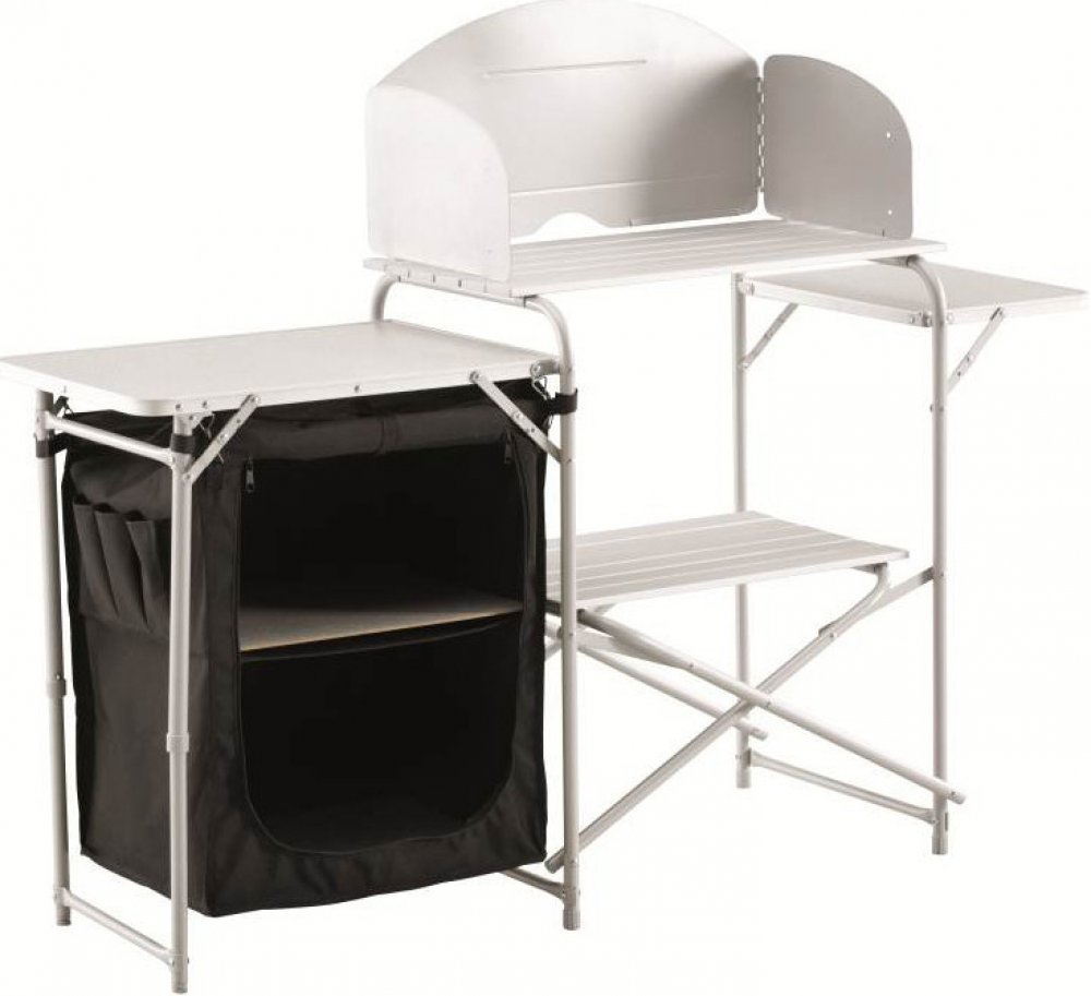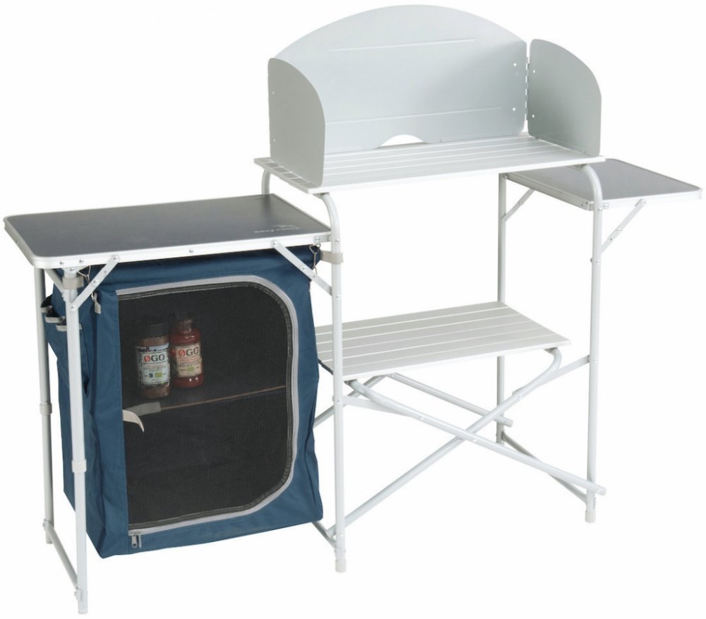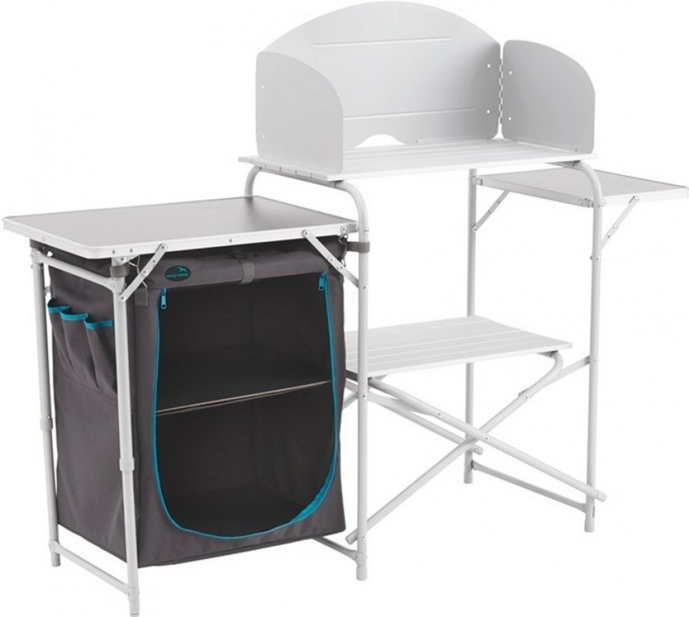 Kompaktní přenosná kuchyňská skříňka Easy Camp Sarin je kompletní venkovní pracoviště s prostornou pracovní deskou a závětrnou ochrannou deskou. Je pohodlně přenosná a přitom velmi stabilní. Když tuto přenosnou kuchyňskou skříňku nepotřebujete, jednoduše jí rozložíte díky srolované horní desce a díky systému skládání lze snadno uložit do přiložených úložné tašky.