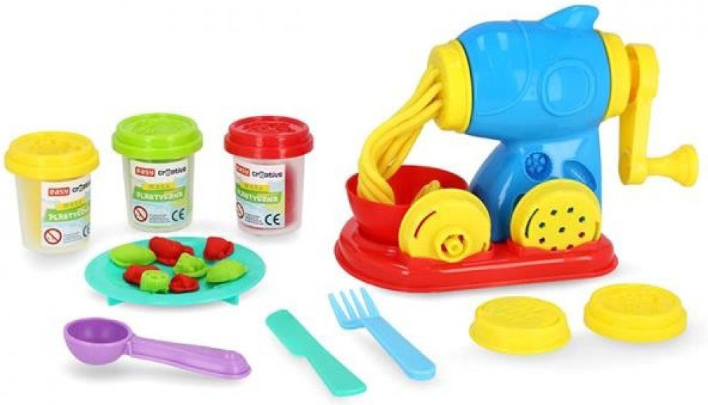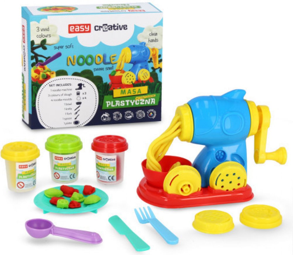 Krásná barevná modelovací hmota se kterou si vymodelujete pravé domácí nudle. Doporučujeme modelínu po každém použití uschovat zpět do kelímku a ten uzavřít. Modelína při pokojové teplotě tvrdne. Pokud ji ponecháte na vzduchu déle než 24 hodin nebude možné s ní dále pracovat. Naopak, pokud budete chtít, aby váš výtvor zůstal ve stejném tvaru, zanechte jej na vzduchu při pokojové teplotě.Balení obsahuje:3 x kelímek s modelínou,1 x stroj na nudle,4 x forma na vytlačování nudlí,1 x miska,1 x talíř,1 x vidlička,1 x nůž,1 x lžíce.