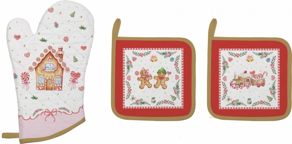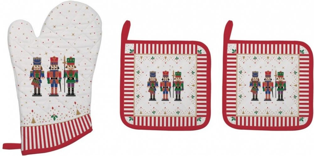 Kuchyňská rukavice a chňapky s oblíbeným motivem Louskáčka jsou nejen praktickým pomocníkem v kuchyni, ale i hezkým vánočním doplňkem. Rukavice a chňapky jsou vhodné pro chycení a přenášení horkých nádob nebo pečících plechů z rozpálené trouby nebo na zvedání rozpálené pokličky.