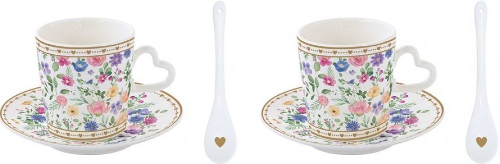 Sada dvou porcelánových šálků na espresso s podšálky a lžičkami z kolekce Mon Amour od italské značky Easy Life. Romantický květinový design, zlaté detaily a ouško ve tvaru srdce dodávají nádech elegance. Baleno v krásné dárkové krabičce – perfektní jako dárek. Porcelánová sada šálků na espresso se lžičkami Mon Amour 100 ml, Easy Life
