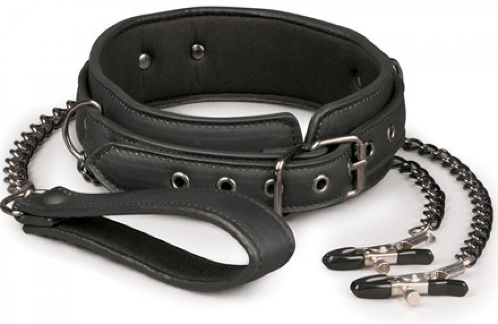 Easy Toys Leather Collar With Nipple Chains Obojek se svorkami na bradavky