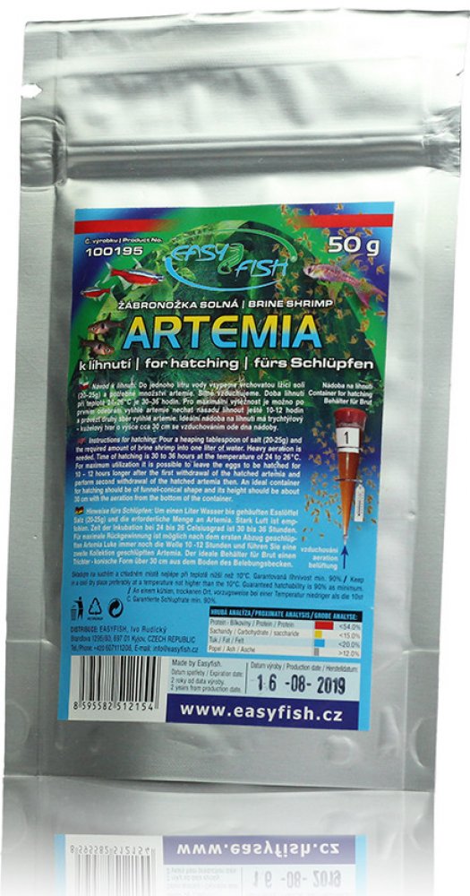 Jednu zarovnanou čajovou lžičku artemie a jednu vrchovatou polévkovou lžíci soli vložíme do 3 litrů odstáté vody teplé 26 - 28°C. Silně vzduchujeme. Doba líhnutí je cca 24 hodin. Skladujte na suchém a chladném místě nejlépe při teplotě nižší než 10°C (!) nejlépe v lednici. Líhnivost min. 90%