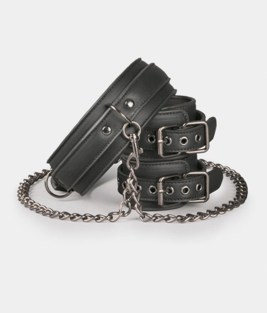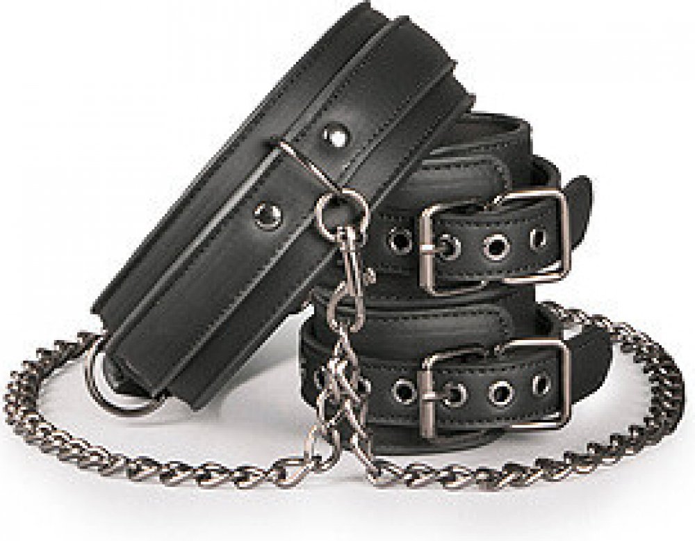 Teď jste pánem vy! Mějte své podřízené pod kontrolou s tímto úžasným bondage setem. Set obsahuje obojek a pouta, která mohou být jednoduše oddělena od sebe pomocí jednoduchého otevření skřipců. Tyto hračky jsou vyrobeny z umělé kůže spolu s pěnou zajišťující pohodlí při nošení obojku a pout. Obojek lze nastavit od 45 do 58 cm a pouta od 11 do 28 cm. Řetěz dodávaný k obojku a poutům má délku 40 cm....