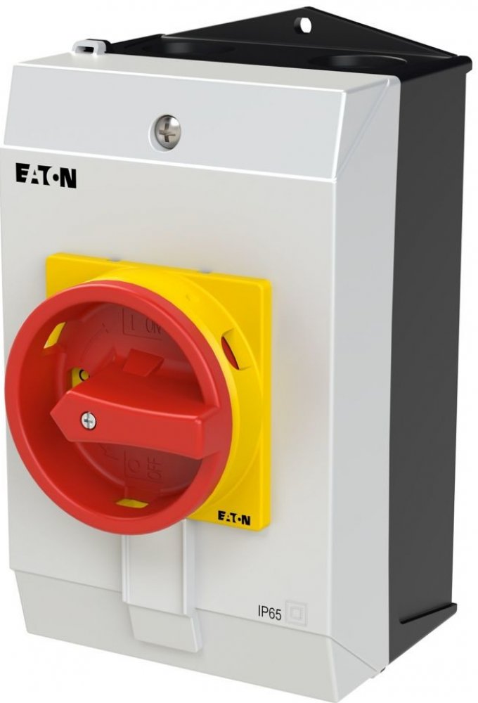 Hlavní spínač/vypínač podle IEC/EN 60947-3, 690V/32A, stupeň krytí vpředu IP65, rukojeť červená s blokovacím věncem žlutým, uzamykatelný v nulové poloze 3 visacími zámky, konstrukce zátěžových vypínačů P1 je velmi kompaktní a robustní. Ruční pohon působí na kontakty v přímém spojení. Při vypnutí se kontakty nuceně otevřou. Konstrukční formy všeobecně: Skříňky pro povrchovou montáž z izolačního materiálu, montáž, centrální upevnění, základní montáž, montáž do rozváděče IVS