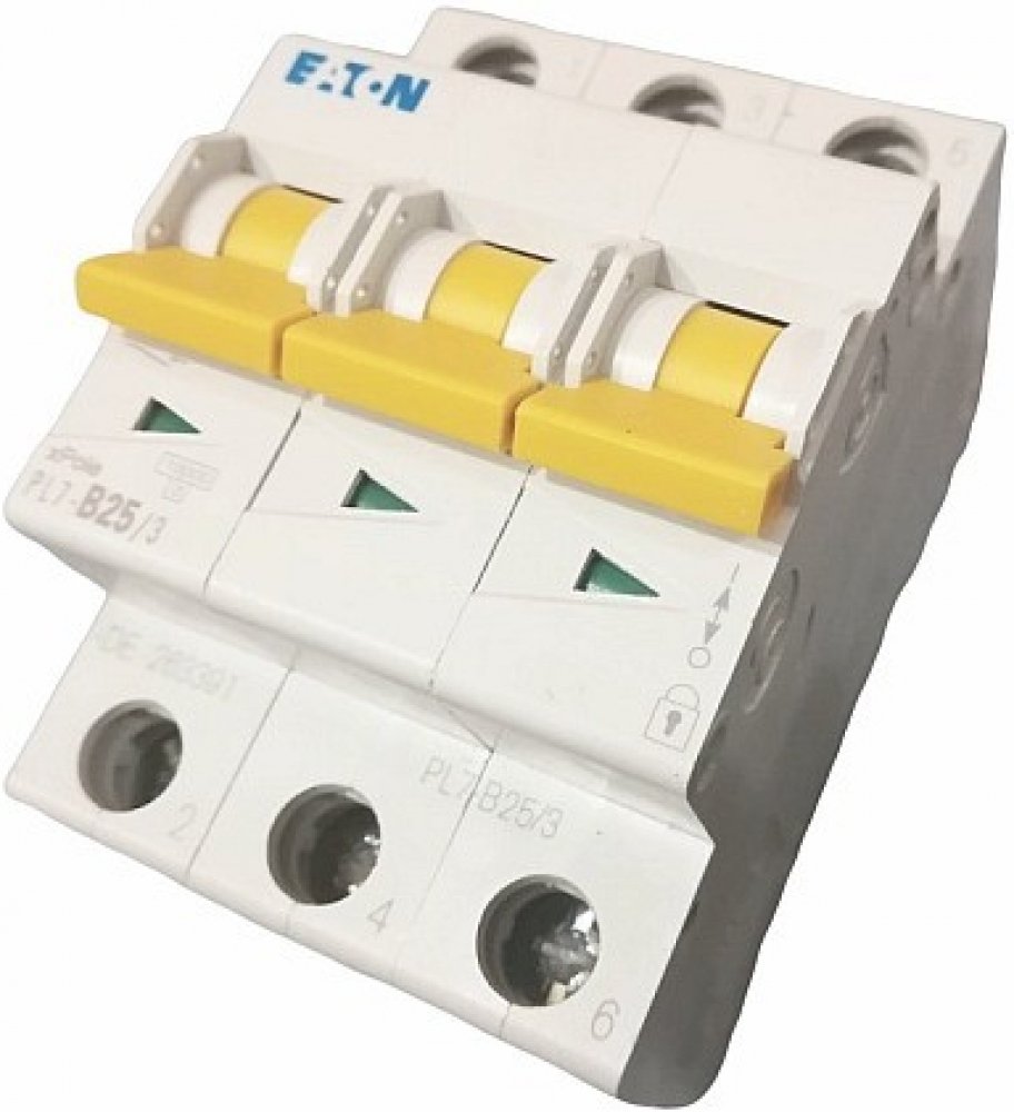 Třífázový jistič Eaton 263391 PL7-B25/3 na DIN lištu je třípólový jistič s charakteristikou zátěže B a maximálním proudem 25 A. Jistič slouží k ochraně elektrických obvodů proti přetížení a zkratu.