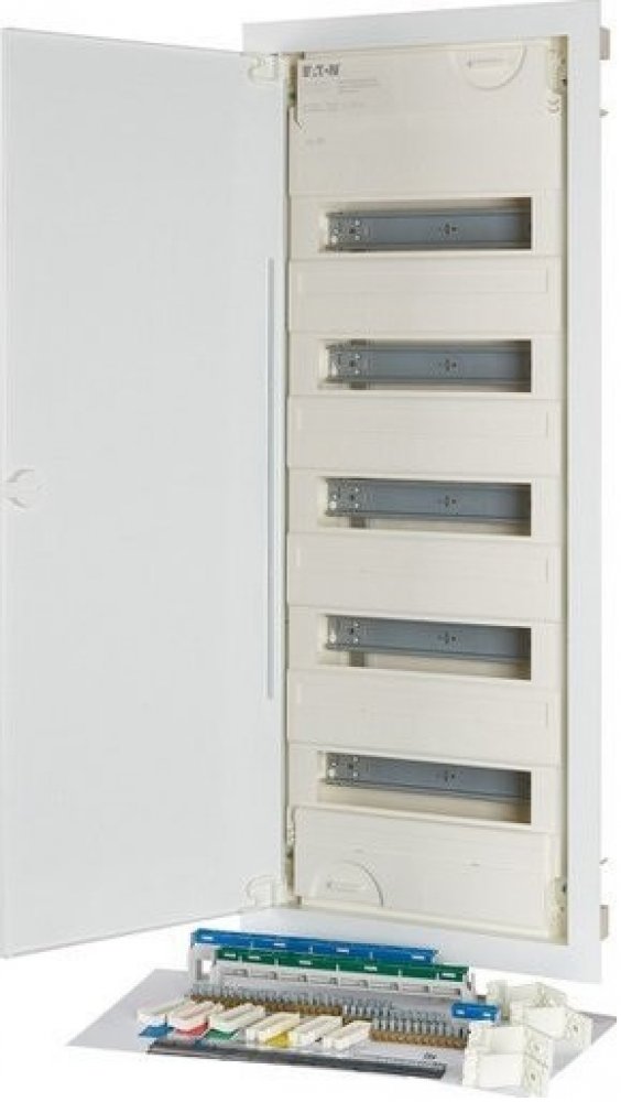 Rozvodnice KLV, pod omítku, plech.dveře, šroubová svorkovnice, řad 5, modulů 70. Součást dodávky: rozvodnice, rám s přístrojovými lištami, krycí deska, N a PE svorkovnice, integrovaná vodováha, sada upevňovacích prvků včetně prvků pro kompenzaci nerovnosti omítky, držák vodičů, sada úchytek, montážní návod, popisovací tabulky s nálepkami. Dle normy: ČSN EN 62208, ČSN EN 60670-24, ČSN EN 61439-3