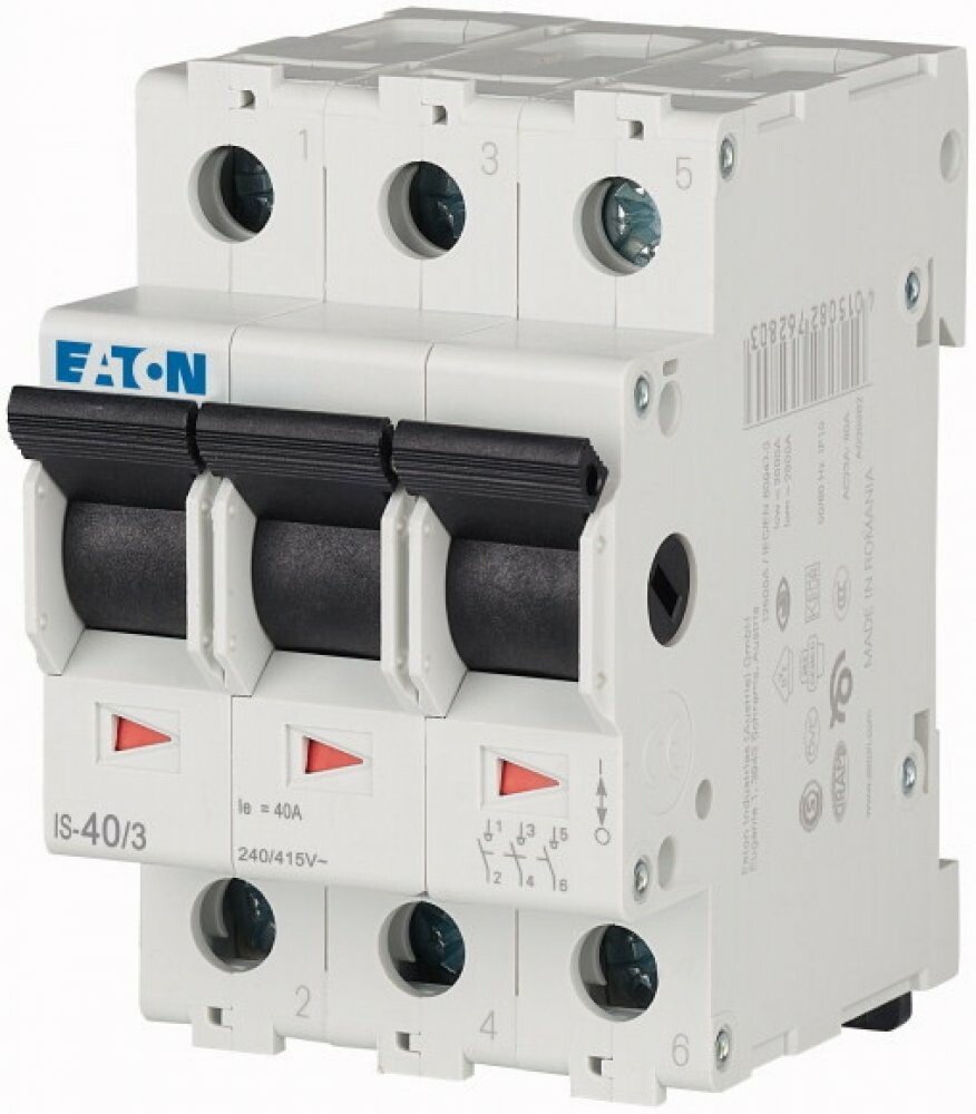 Instalační vypínač EATON IS-40/3 je konstruován pro napětí 240 V a proud 40 A. Dimenzovaná spínací schopnost u něj činí 12,5 kA a odolnost proti zkratu 2 kA. Pro správný provoz je třeba, aby se teplota okolního vzduchu v místě, kde bude vypínač nainstalován, pohybovala v rozmezí od -5 do +40°C.
