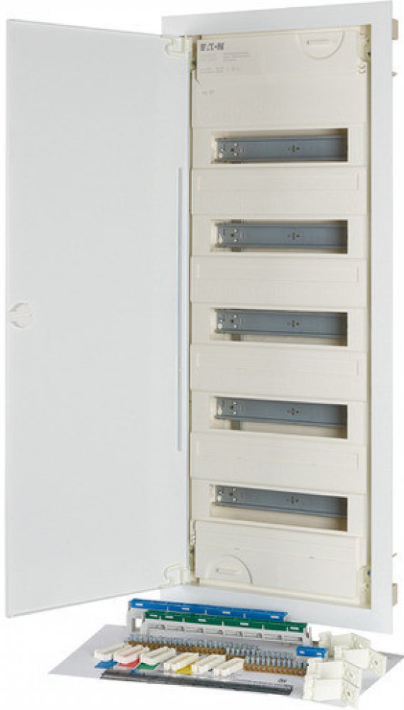 Rozvodnice KLV, pod omítku, plech.dveře, šroubová svorkovnice, řad 5, modulů 70. Součást dodávky: rozvodnice, rám s přístrojovými lištami, krycí deska, N a PE svorkovnice, integrovaná vodováha, sada upevňovacích prvků včetně prvků pro kompenzaci nerovnosti omítky, držák vodičů, sada úchytek, montážní návod, popisovací tabulky s nálepkami. Dle normy: ČSN EN 62208, ČSN EN 60670-24, ČSN EN 61439-3