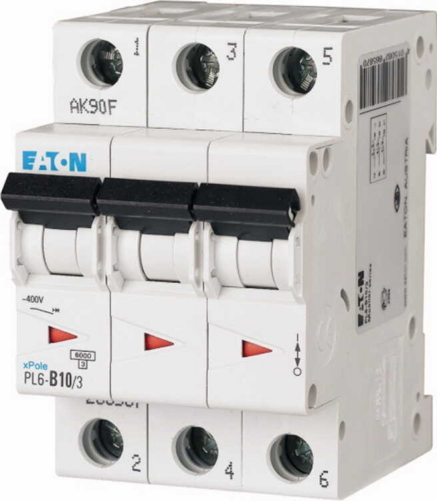 Jistič Eaton PL6-B10/3 je třípólový jistič, který rozpojuje elektrický obvod při 10 A. Zkratová odolnost činí 6 kA a jistič spadá pod charakteristiku B pro jištění obvodů s nízkým proudovým rázem. Stupeň krytí je IP20. K jističi si pořiďte vhodnou propojovací lištu.