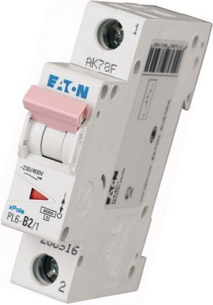 Jistič PL6-B2/1 1P 2A B 6kA Eaton 286516 Jistič PL6-B2/1- jmenovité napětí 230/400V AC- vypínací schopnost 6 kA (ČSN EN 60898)- vypínací charakteristiky typu B, C- montáž na přístrojovou lištu- stupeň krytí IP20- signalizace vypnuto-zapnuto- průřez připojovaného vodiče 1 - 25 mm2 Technické parametry- jmenovitý proud: 2A