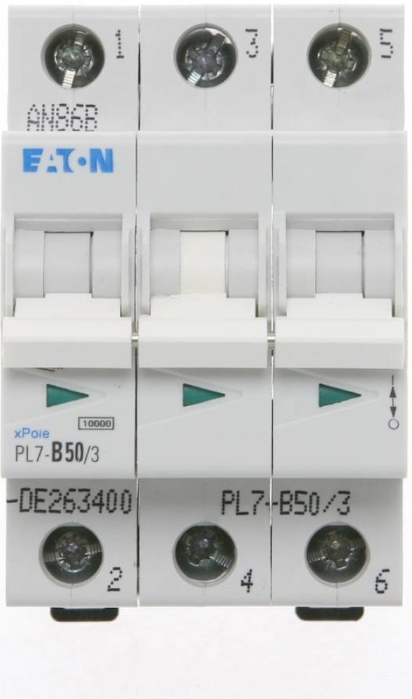 Třífázový jistič PL7-B50/3 (263400) od výrobce Eaton poskytuje spolehlivou ochranu elektrických obvodů před přetížením a zkratem. Je vybaven charakteristikou B, která zajišťuje vypnutí při 3–5násobku jmenovitého proudu, což ho činí vhodným pro různé typy aplikací v domovních i komerčních instalacích. Tento jistič s jmenovitým proudem 50 A, napětím 400V AC a zkratovou odolností 10 kA je určen pro montáž na DIN lištu (šířka modulu 52,5 mm). Inovované provedení jističů PL7 se zámečkem plně vyhovuje připojovacím podmínkám distribučních společností ČEZ, E.ON a PRE, a je tak ideální volbou pro použití jako hlavní jistič před elektroměrem. Díky tomu je vhodný jak pro bytové, tak i průmyslové aplikace. Splňuje požadavky normy IEC/EN 60898-1 a je navržen pro provoz v teplotním rozmezí od -25 °C do +55 °C.