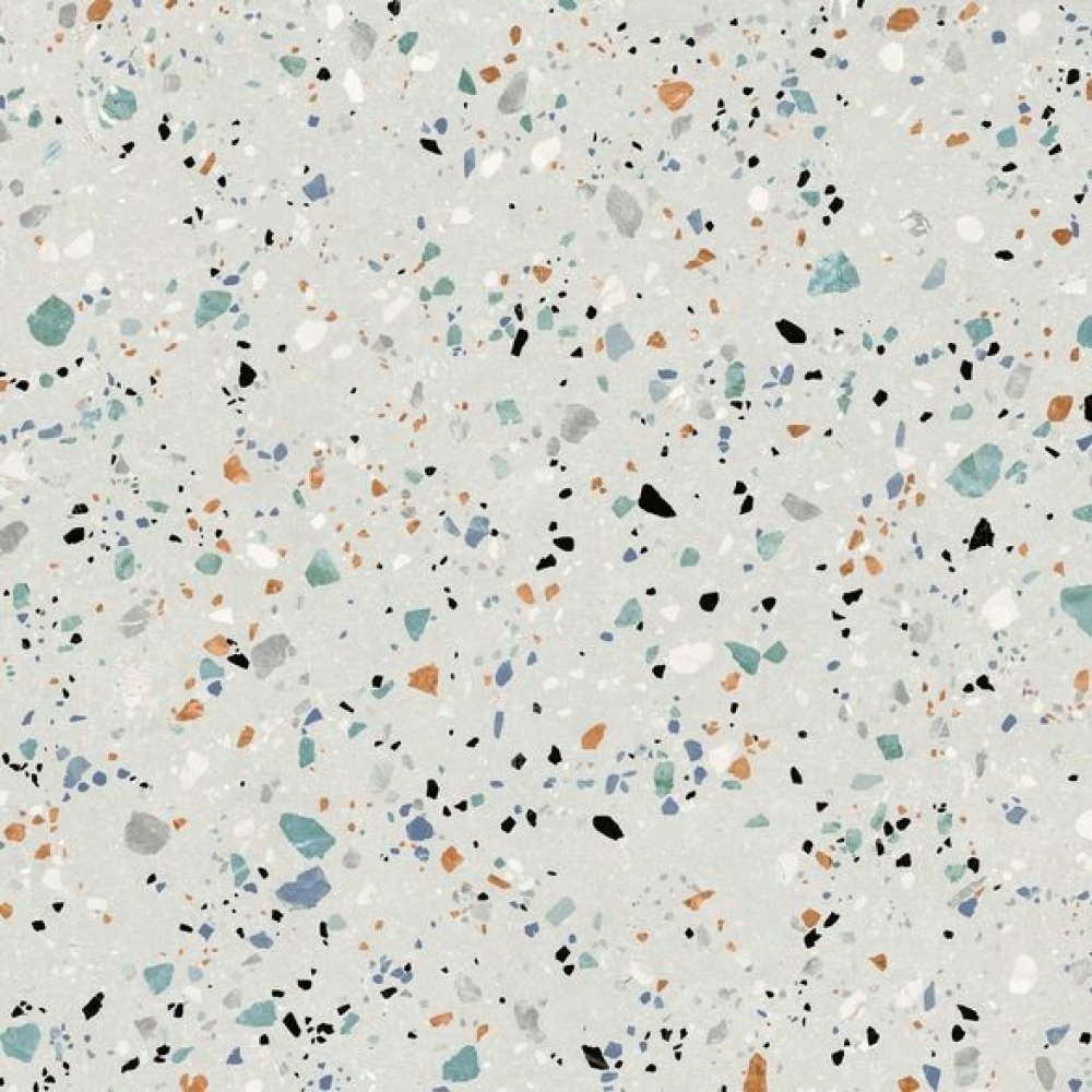 Rektifikovaná, mrazuvzdorná dlažba v barvě šedobílá v designu art terrazzo o rozměru 60 x 60 cm a tloušťce 9 mm s matným povrchem. S velkými odchylkami v kolísání odstínů barev, struktury povrchu a kresby. S vyšší odolností vůči opotřebení (PEI 4).Vhodné do interiéru i exteriéru.