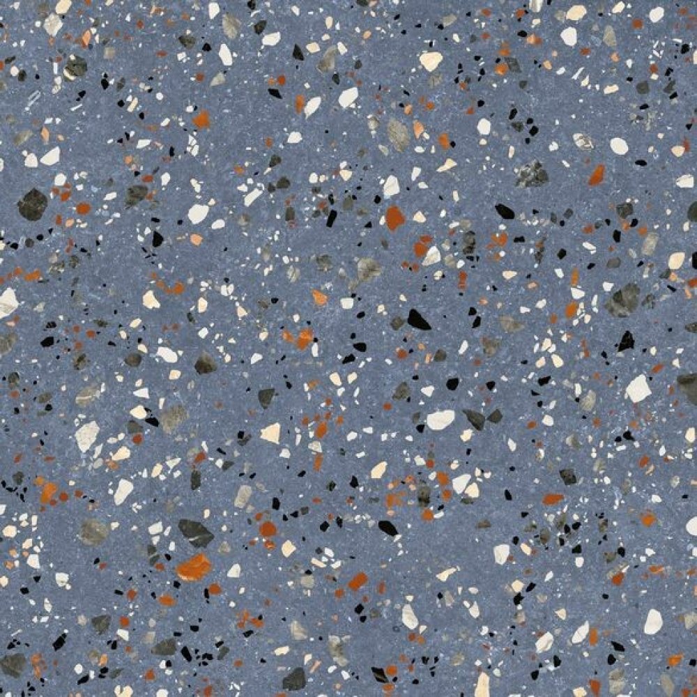 Rektifikovaná, mrazuvzdorná dlažba v barvě modrá v designu art terrazzo o rozměru 60 x 60 cm a tloušťce 9 mm s matným povrchem. S velkými odchylkami v kolísání odstínů barev, struktury povrchu a kresby. Se střední odolností vůči opotřebení (PEI 3).Vhodné do interiéru i exteriéru.