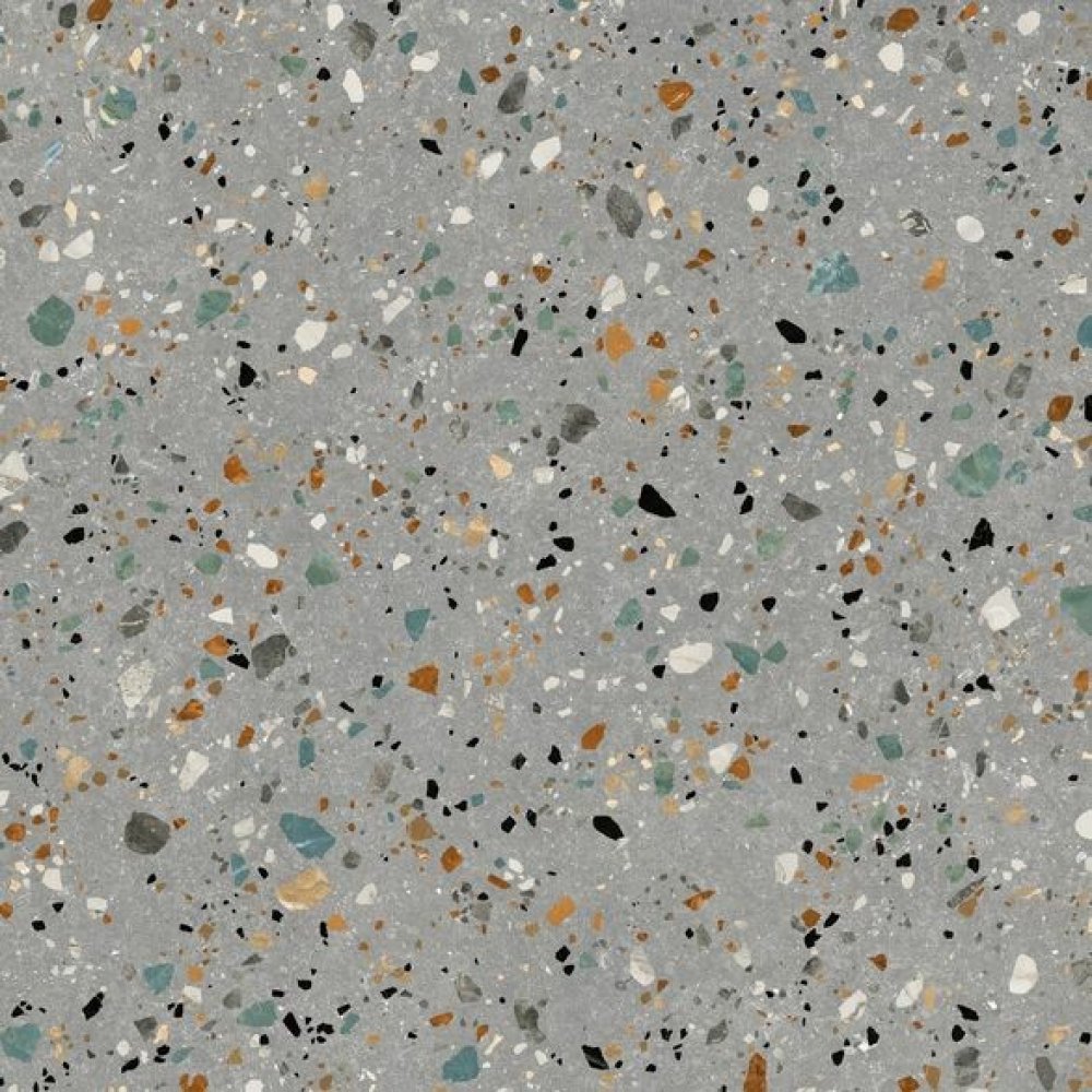 Rektifikovaná, mrazuvzdorná dlažba v barvě šedá v designu art terrazzo o rozměru 60 x 60 cm a tloušťce 9 mm s matným povrchem. S velkými odchylkami v kolísání odstínů barev, struktury povrchu a kresby. Se střední odolností vůči opotřebení (PEI 3).Vhodné do interiéru i exteriéru.