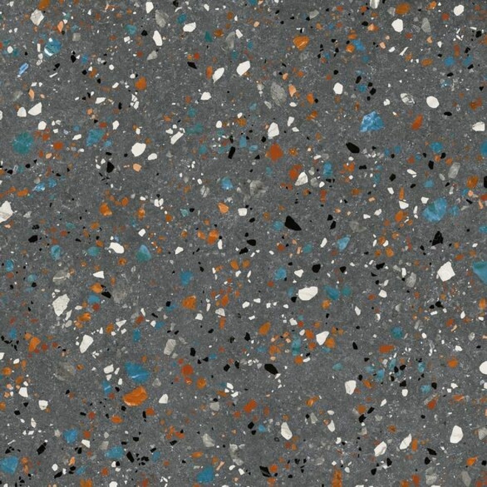 Rektifikovaná, mrazuvzdorná dlažba v barvě tmavě šedá v designu art terrazzo o rozměru 60 x 60 cm a tloušťce 9 mm s matným povrchem. S velkými odchylkami v kolísání odstínů barev, struktury povrchu a kresby. Se střední odolností vůči opotřebení (PEI 3).Vhodné do interiéru i exteriéru.