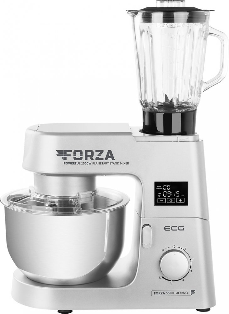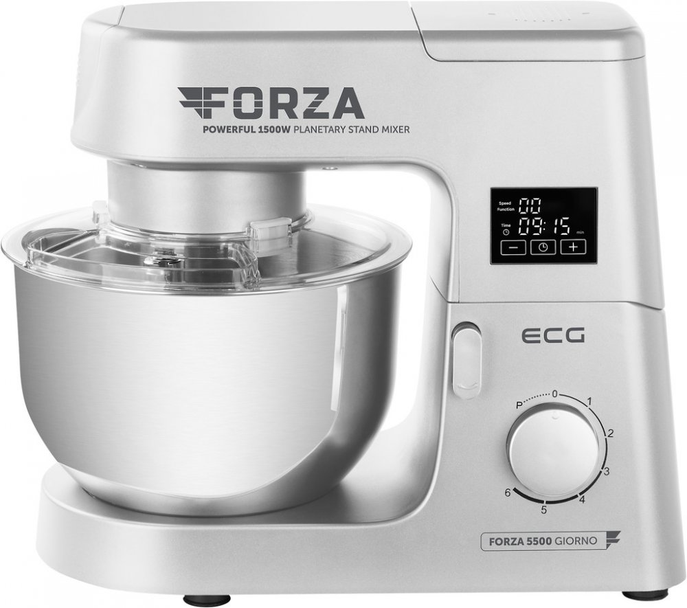 Je pro vás kuchyně královstvím, v němž se cítíte jako ryba ve vodě? Přivítejte v ní multifunkční kuchyňský robot ECG Forza 5500 Giorno a posuňte své kulinářské umění zase o krůček dál. Tento šikovný pomocník vám díky bohatému příslušenství spolehlivě pomůže při hnětení těsta, mletí masa i třeba šlehání smetany. Ať už tak rádi vaříte, nebo dáváte přednost pečení, práce vám s ním půjde krásně od ruky.K přednostem robotu patří robustní zpracování, velká míchací mísa z nerezové oceli (objem 6,5 l) či spolehlivý výkonný motor (1500 W). Jde tak o pokročilý spotřebič, který si musí zamilovat každý milovník gastronomie.Pokud patříte mezi kuchaře, jejichž výbava musí být vždy perfektní, tento robot je tady právě pro vás. Svým zpracováním vás totiž ECG Forza 5500 Giorno rozhodně nezklame – motor je vyroben z čisté mědi, převody jsou celokovové a zárukou kvality je i robustní tělo z ABS plastu, které eliminuje nežádoucí chvění.K tomu všemu přidejte ještě protiskluzové nožičky s přísavkami, které zajišťují stabilní postavení, a máte přístroj, který splňuje i ty nejvyšší nároky.Chystáte pro svou rodinu oblíbený dezert či jinou pochoutku? Vložte suroviny na těsto do robotu a jejich smísení nechte bez obav na něm. Díky planetární rotaci se veškeré ingredience spojí naprosto dokonale. Nástavce přístroje se totiž současně otáčejí kolem své vlastní osy i kolem osy převodovky.Robot navíc nabízí variabilní regulaci otáček s plynulým rozběhem a 6 rychlostmi, takže můžete jeho činnost přesně přizpůsobit receptu, který právě chystáte. A aby toho nebylo málo, využívat můžete i speciální pulzní režim.S ovládáním kuchyňského robotu si hravě poradí naprosto každý. Ovládá se pohodlně pomocí praktického otočného voliče rychlostí. K nastavení dalších funkcí, např. doby míchání, slouží intuitivní dotykový panel, který je doplněn o přehledný LED displej.Praktická je zde i funkce časovače, díky níž si můžete nastavit přesný čas, po který má robot pracovat. Když tak např. chystáte šlehačku, nemusíte se obávat, že byste ji příliš dlouhou přípravou takříkajíc přešlehali – prostě nastavíte optimální dobu šlehání a za chvilku máte hotovo.Kuchyňský robot ECG Forza 5500 Giorno vám pomůže s mnoha různými činnostmi. Jeho výbava je totiž opravdu bohatá. Posuďte sami: využívat můžete míchací hák na těsto, šlehací hák i šlehací metlu z nerezové oceli. Také máte k dispozici mlýnek na maso se 3 vyměnitelnými disky pro mletí různých druhů masa, bubnové struhadlo nebo speciální tvořítko na cukroví či sušenky. A samozřejmě nesmí chybět ani klasický mixér s kvalitními čepelemi z nerezové oceli a skleněnou nádobou o objemu 1,5 l.Pokud máte rádi italskou kuchyni, jistě oceníte i možnost dokoupení speciálního výrobníku těstovin (Pasta Maker).