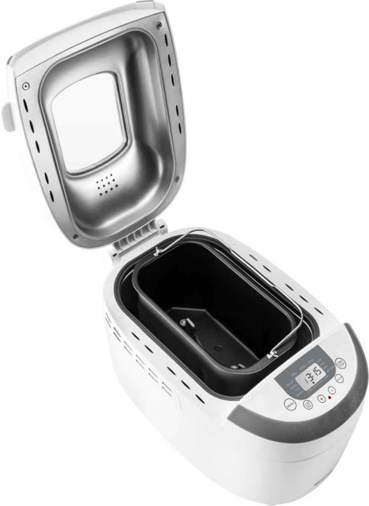 Domácí pekárna 12 programů, 2 hnětací háky, max. hmotnost chleba 1250 g, volba stupně propečení kůrky, LCD displej, odložený start až 15 hodin, udržení teploty až 60 min, okno, forma s nepřilnavým povrchem, příkon 850 W.