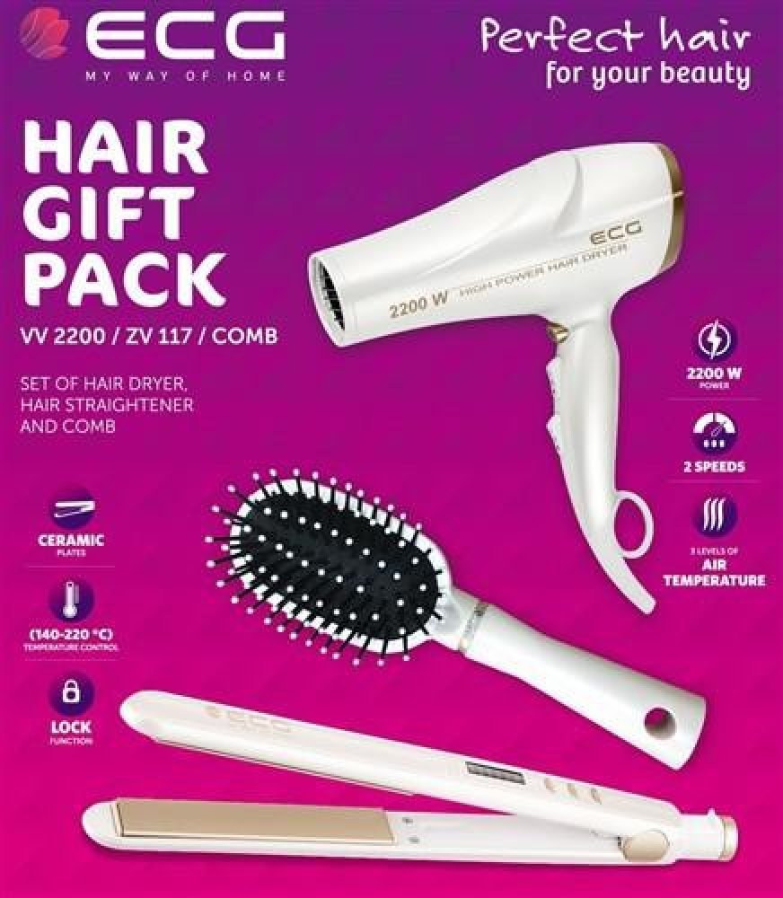 sada vysoušeče, žehlička na vlasy a hřebenu, vysoušeč: 2200 W, 2 rychlosti, 3 úrovně teploty, koncentrátor, difuzér, žehlička:keramické desky, nastavení teploty (140-220 °C), aut. vypnutí po 30 minutách