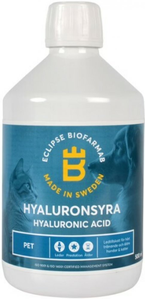 Eclipse Biofarmab Hyaluronic Acid pro psy a kočky je tekutá kyselina hyaluronová s vysokou molekulovou hmotností. Používá se k zachování normální funkce kloubů. Kyselina hyaluronová je přirozeně přítomna v synoviální tekutině, kde má tlumicí a lubrikační funkci.