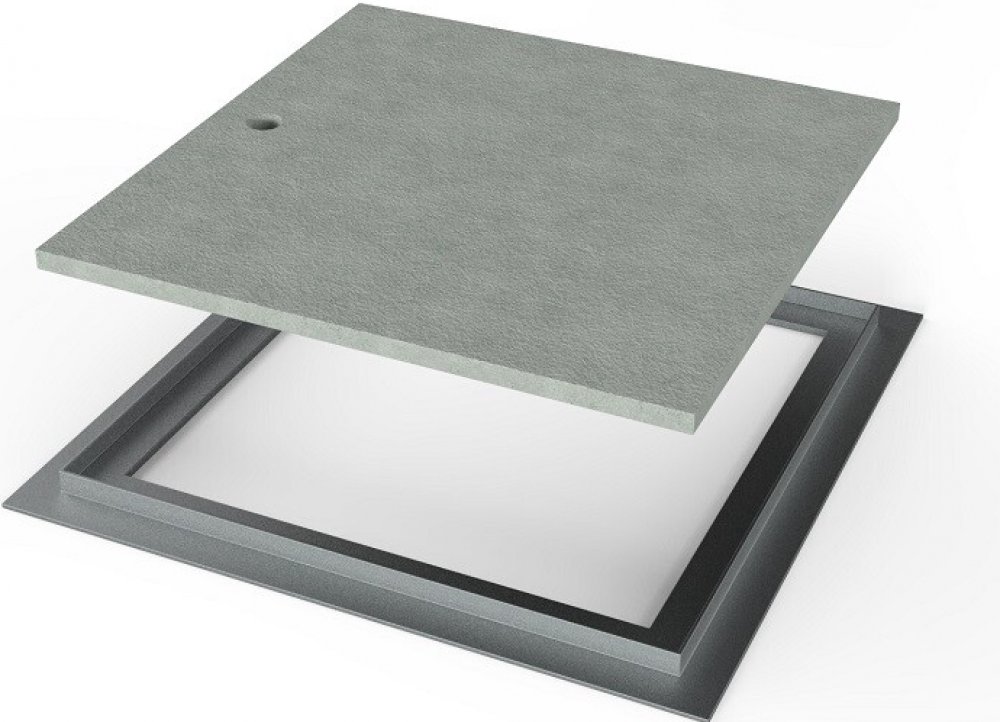 Kompozitový čtvercový poklop pochozí s T-rámem pro snadné kotvení do betonu. Bez těsnění, s okem pro otevření. Pro zakrytí šachet a otvorů v pochůzných plochách.