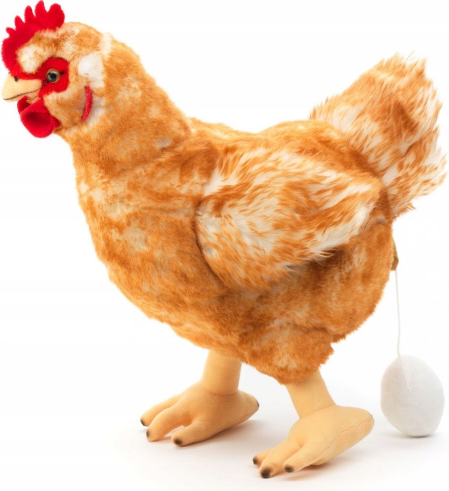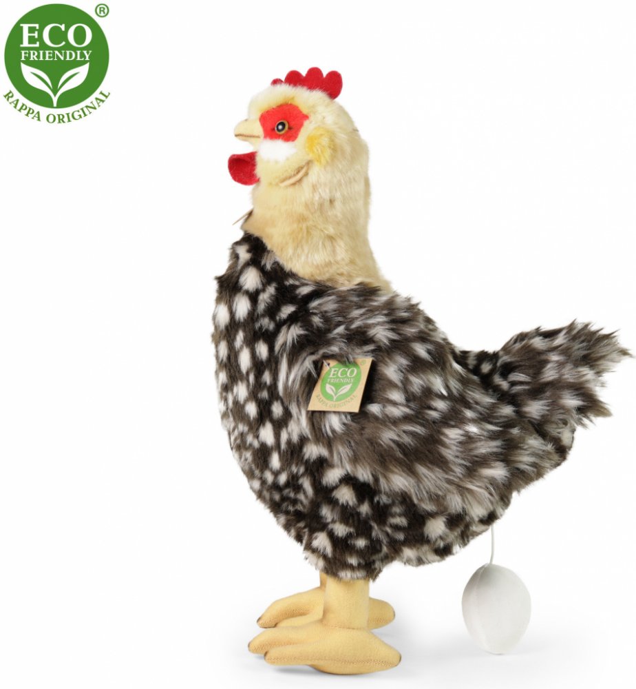 Krásná kropenatá slepička z plyše, věrně zpracované zvířátko, s ekologickou výplní uvnitř, pro všechny milovníky plyšáků. Uvnitř slepičky je bílé vajíčko na provázku.