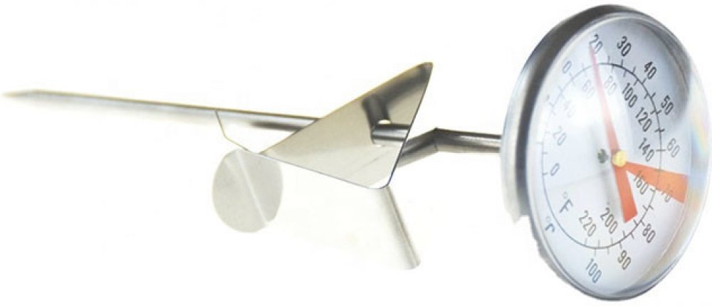 Teploměr pro sledování teploty mléka při šlehání, vyrobený z leštěné nerezové oceli. S jeho použitím zamezíte přípravě kávového nápoje z nedostatečně teplého, nebo naopak připáleného a zahořklého mléka. Navíc při vysoké teplotě dochází k degradaci pěny