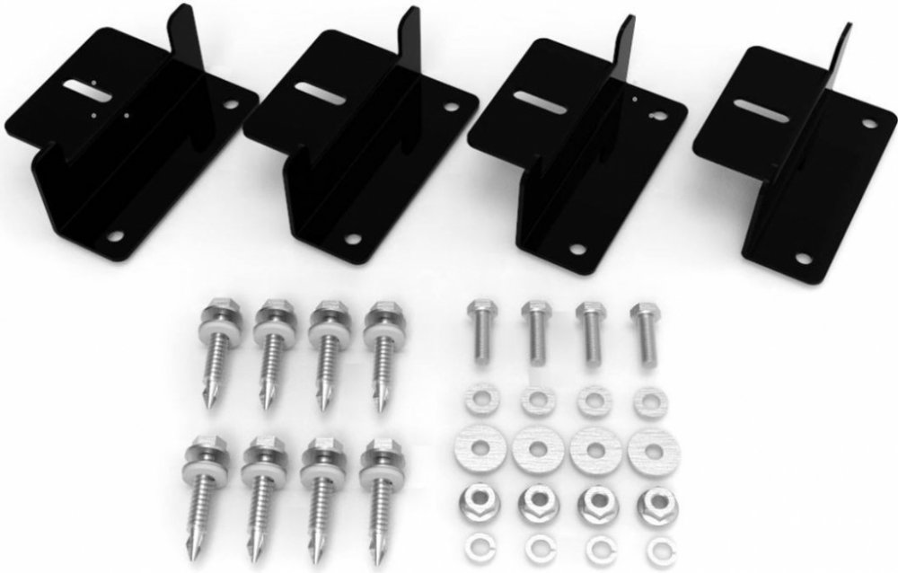 Obsah balení: 4x "Z" držák, 4x M6 podložka, 4x M6 pérová podložka, 4x M6 přírubová matice, 4x M6-16 šestihranný šroub, 4x M6 plochá podložka, 8x samořezný šroub s plastovým pojistným kroužkem. Pro uchycení 100W panelu je potřeba 1 sada, pro uchycení 400W panelu jsou potřeba 2 sady.