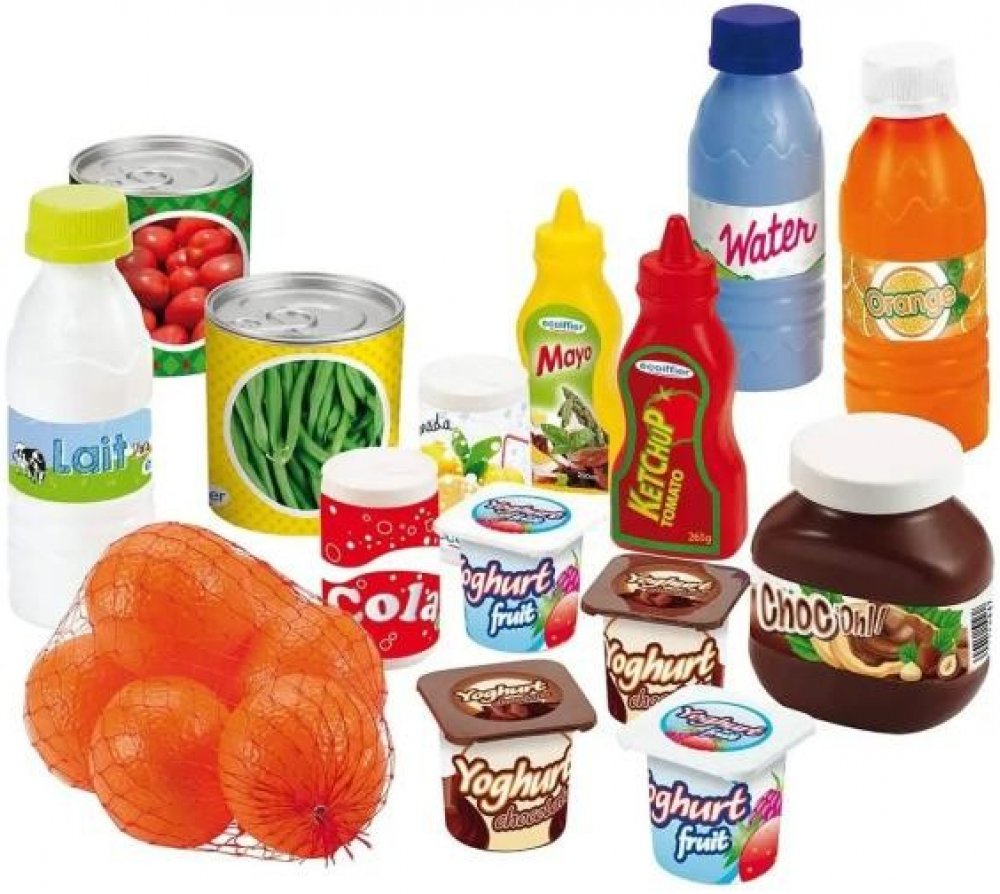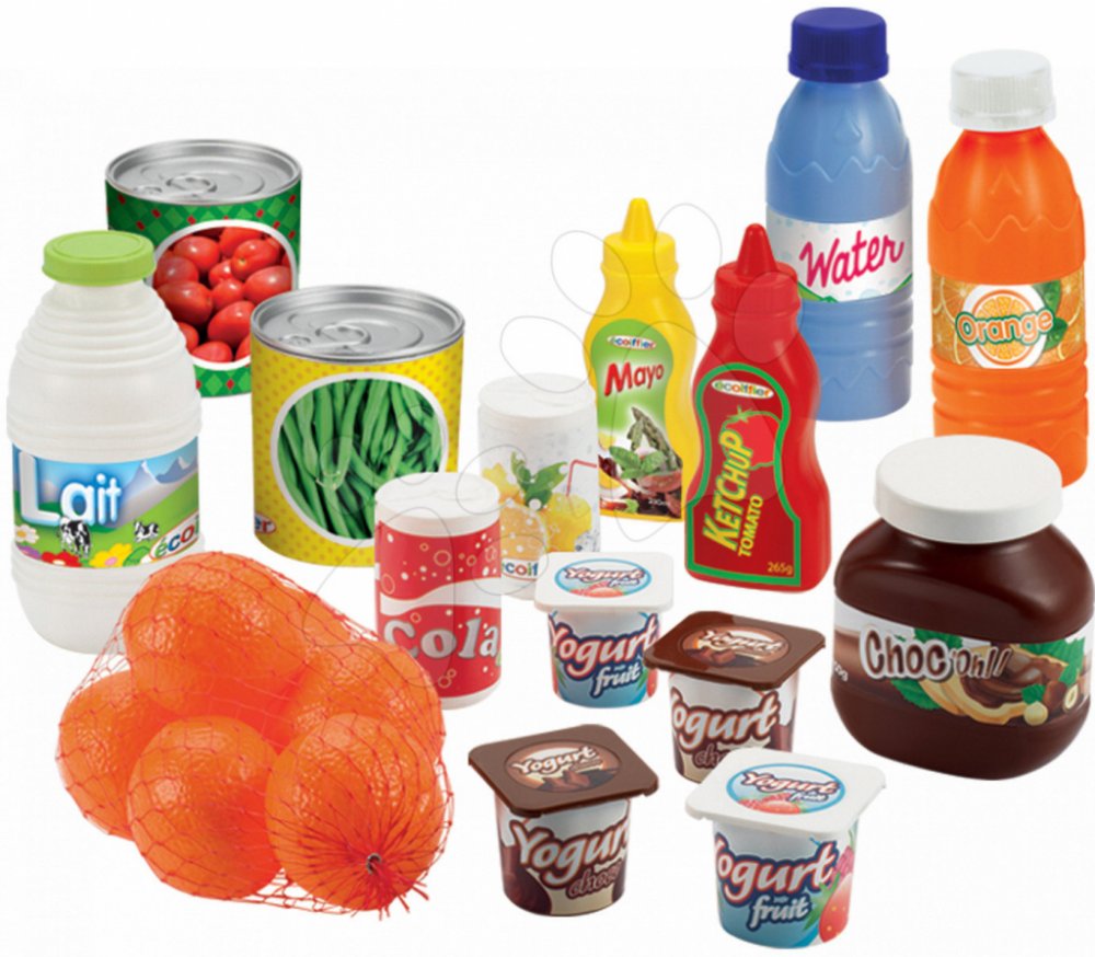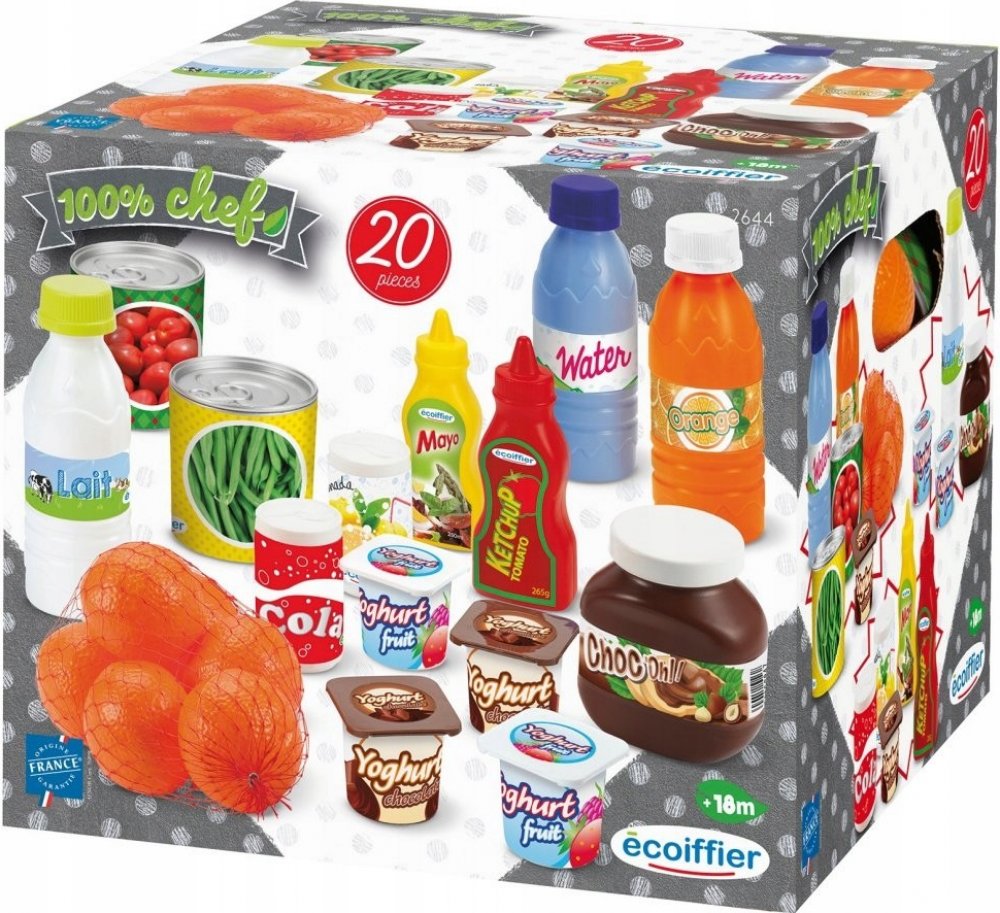 Sada potravin do kuchyňky 100% Chef Écoiffier je originální sada doplňků do kuchyňky. Dětské potraviny jsou vhodné od 18 měsíců. Sadu tvoří 20 doplňků, ke kterým patří plechovky s hráškem a rajčaty, nutela, jogurty, kola, mléko, džus, minerálka, pomeranče, majonéza a kečup. Souprava potravin pro děti se hodí do dětské kuchyňky, ale i na samostatnou hru.