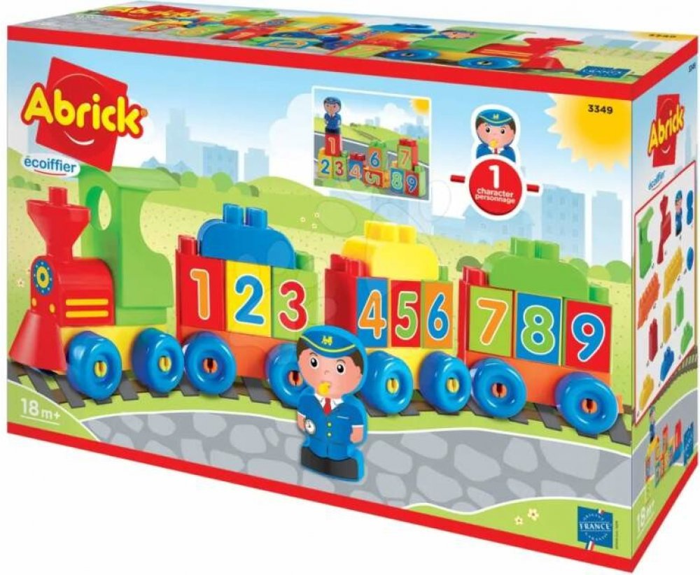 Stavebnice Vláček s čísly z řady Abrick potěší chlapce i dívky od 18 měsíců. Stavebnici od francouzského Écoiffier tvoří kvalitní pestrobarevné dílky, díky kterým si malý železničář dokáže sestavit lokomotivu s 3 vagóny, které tvoří dílky s čísly od 1 do 9. Děti se tak jednoduše naučí počítat základní čísla, uspořádají je od nejmenšího po největší, a přitom se výborně baví. Součástí stavebnice je i figurka strojvedoucího v uniformě, který pomůže dítěti řídit vláček.
